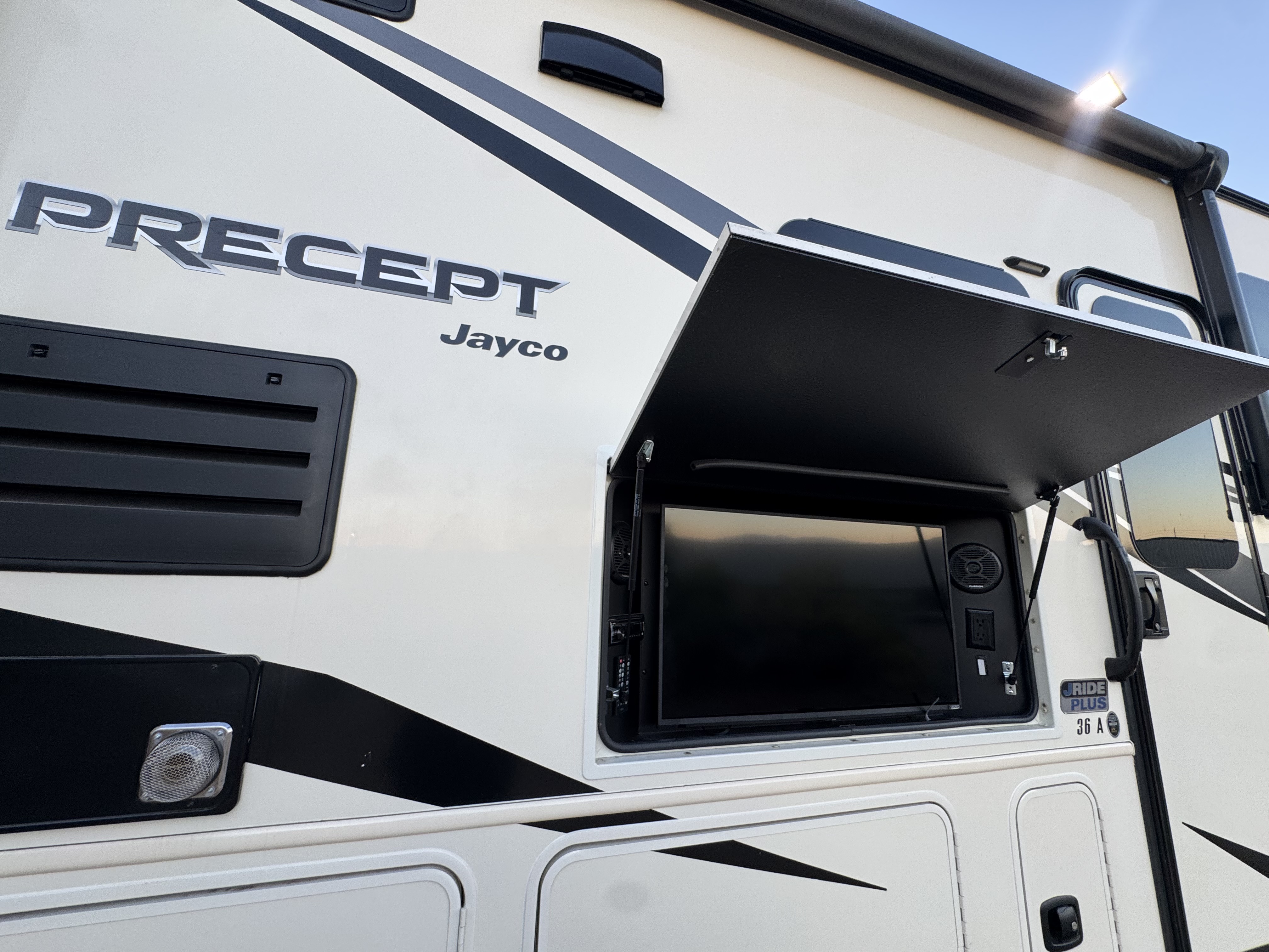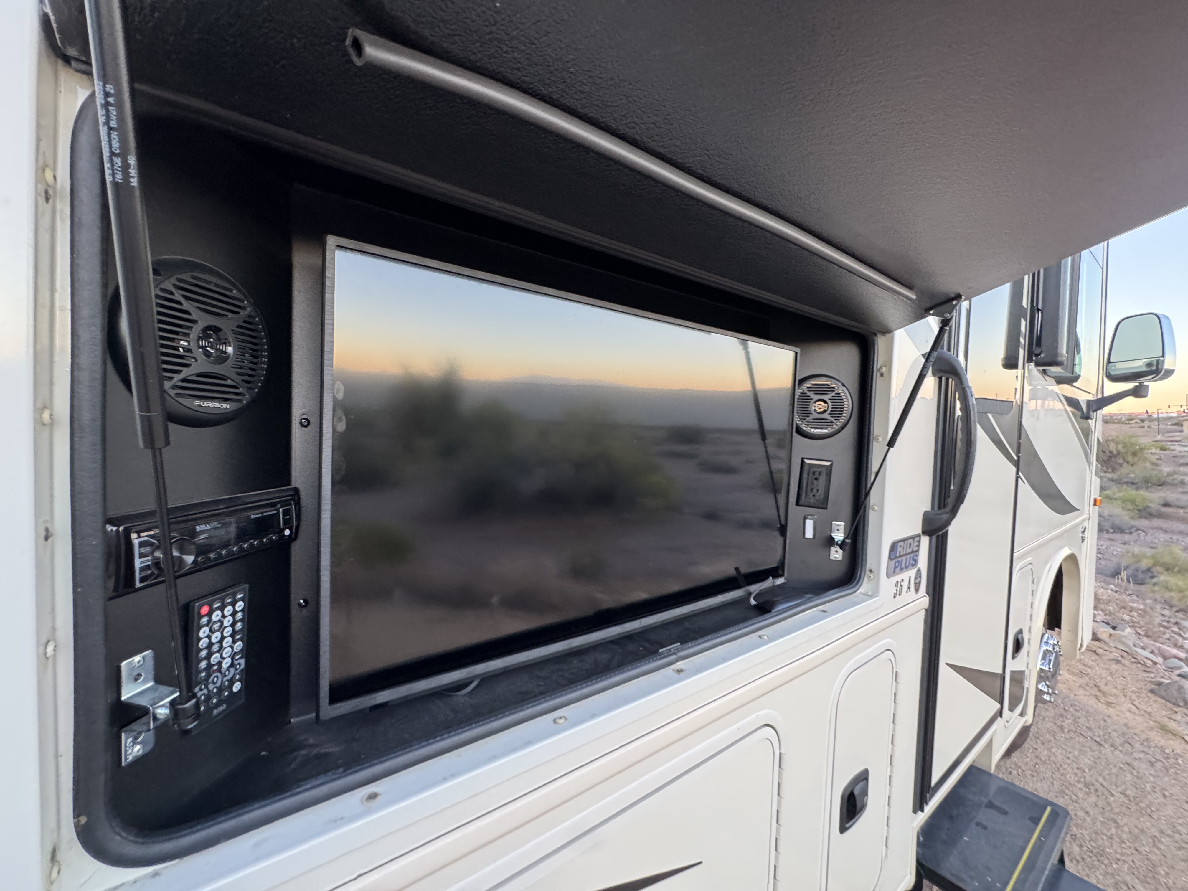 - Exterior entertainment center with outside speakers, LED TV mounted on swivel bracket and single-disc DVD/FM radio