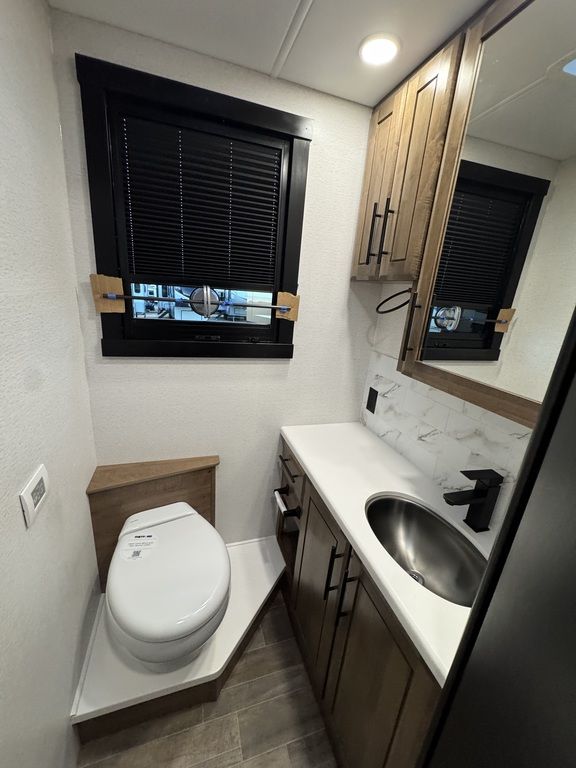 When it comes to the Accolade XT interior, choose from two décor packages, two wood packages and six eye-catching Sikkens full-body paint schemes. Light and airy or warm and cozy, the Accolade XT has options to design the coach of your dreams. That includes floorplan variation. Choose from a 30-foot floorplan with no slides, up to a 37-foot floorplan with two slides for those who need more space. Lippert 4000 Series windows with integrated day/night cassette shades look great inside and out. Outside, these frameless windows protect seals from the sun, while inside, wood trim around the windows eliminates the need for valances and provides a clean look. As an added bonus, the windows open further than standard crank windows for better ventilation. The macerating porcelain toilet breaks down waste before it enters the black tank - reducing the risk of blockages and optimizing tank capacity.