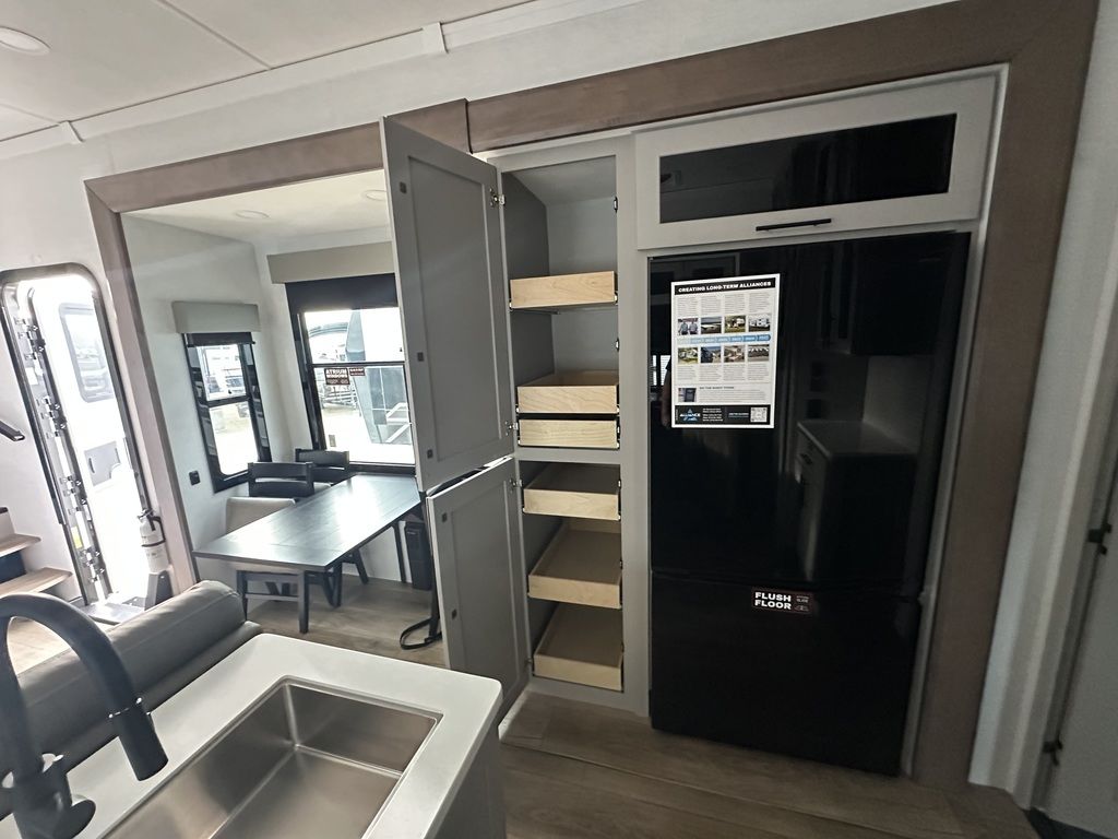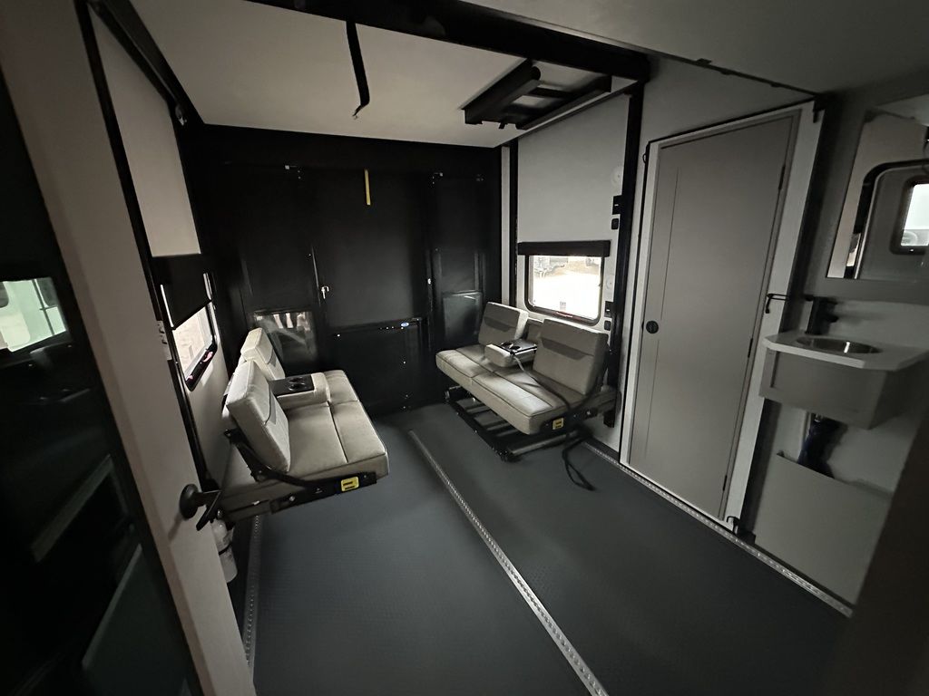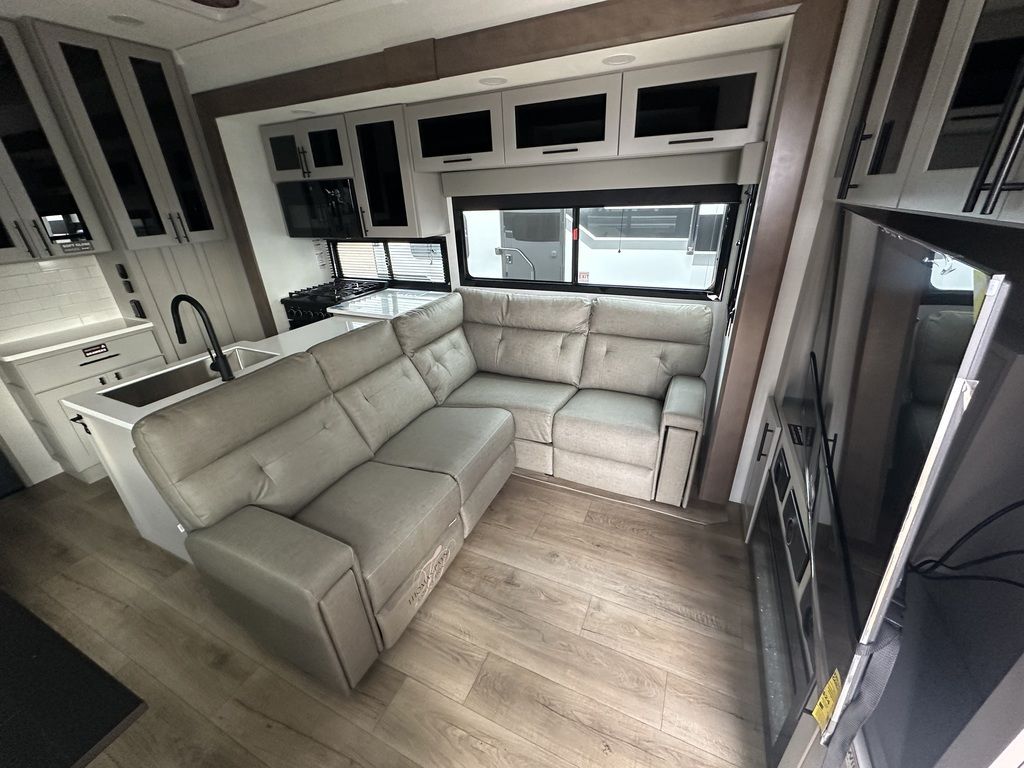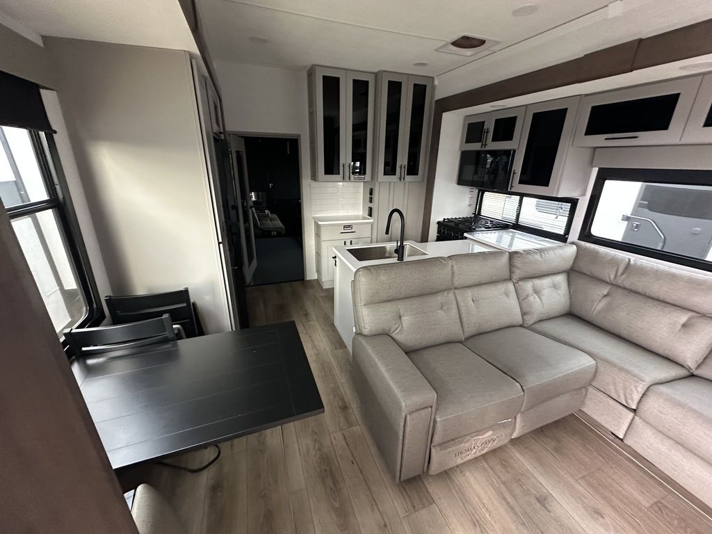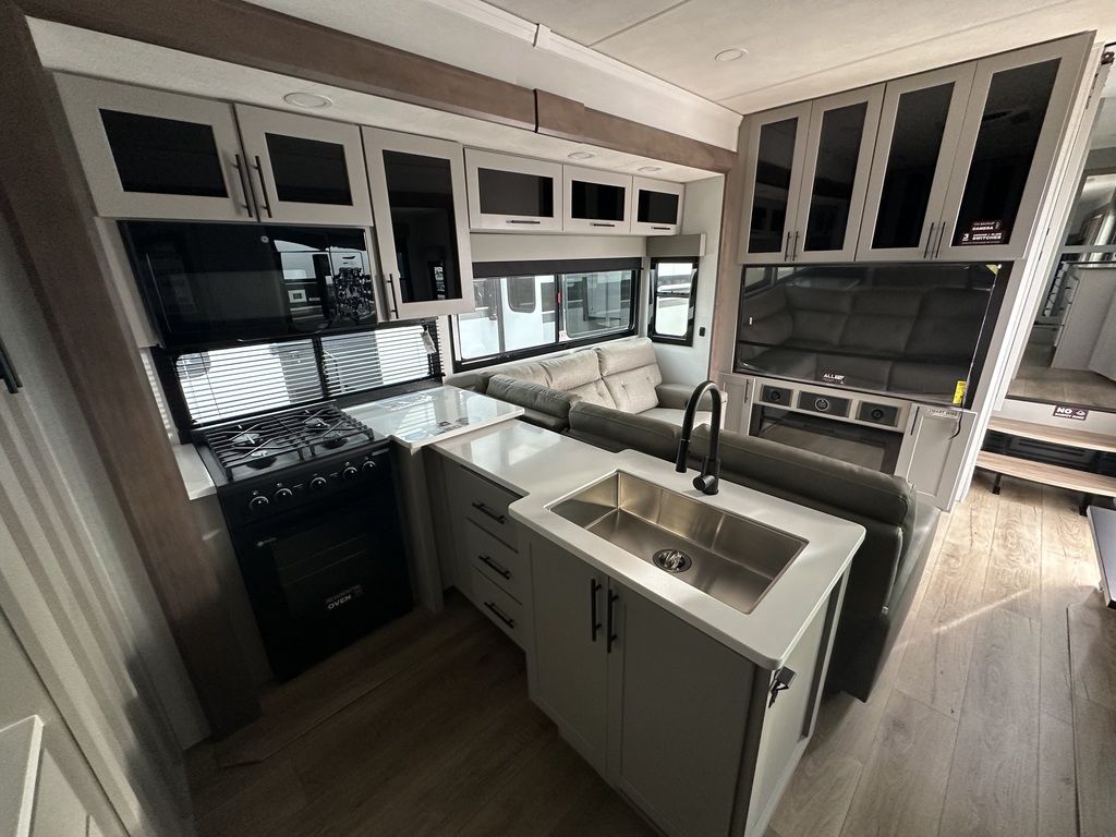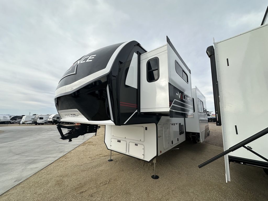 You can bring your toys with you wherever you go with any one of these Alliance RV Valor toy hauler fifth wheels! They are adventure-ready with a quality build from the walk on roof with seamless PVC roof covering to the commercial grade vinyl flooring and MorRyde CRE3000 suspension system. The Performance Running Gear package comes with a 101" wide-body benchmark chassis platform, Dexter axles, and a space enhancing drop frame storage compartment to pack in all your riding gear. You can even go off-gridding thanks to the Off the Grid Pack that has two 400-watt solar panels, generator prep, a 60-amp charge controller, and a 100-amp hour lithium iron phosphate battery. Some of the interior comforts you will enjoy are the hardwood cabinet doors and drawers, solid surface kitchen countertops, and commercial grade vinyl flooring with no carpet to make clean up a breeze. The Valor toy haulers are also the Masters of 12 Volt with USB charging station throughout, a 12V refrigerator, and more 12-volt features to make camping hassle-free!