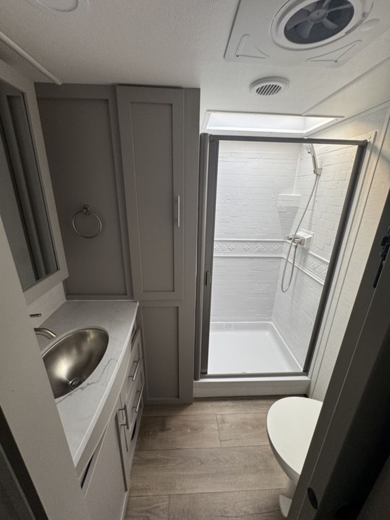 - The Avenue 26RD fifth wheel is the perfect getaway for couples looking to hit the road in comfort and style. The front private bedroom features a queen bed with nightstands on either side and a wardrobe to keep your clothes organized. The full bathroom includes a 30" x 36" shower and a linen closet for convenient towel storage.