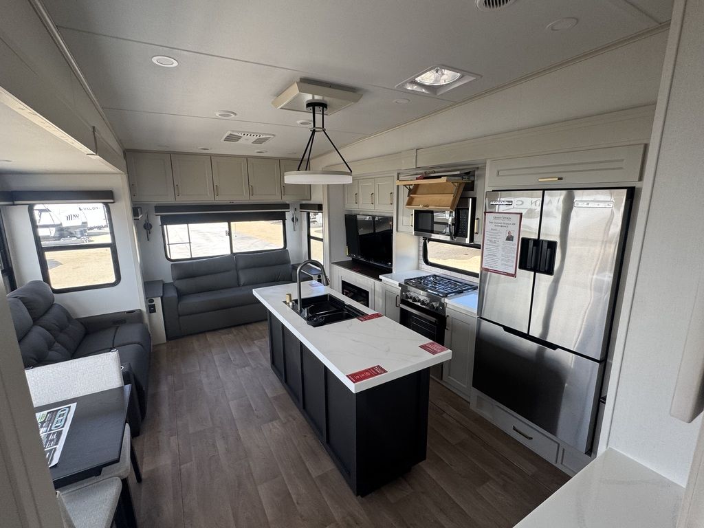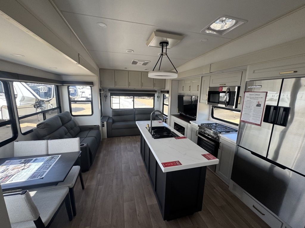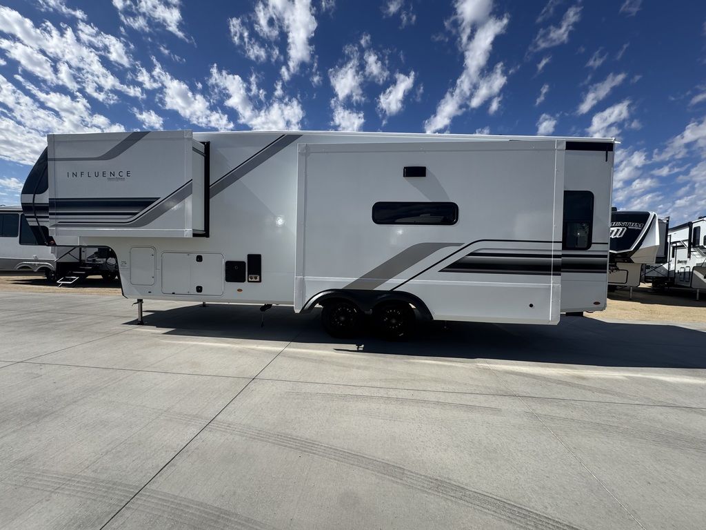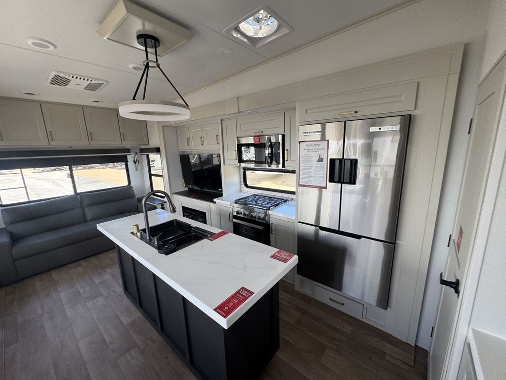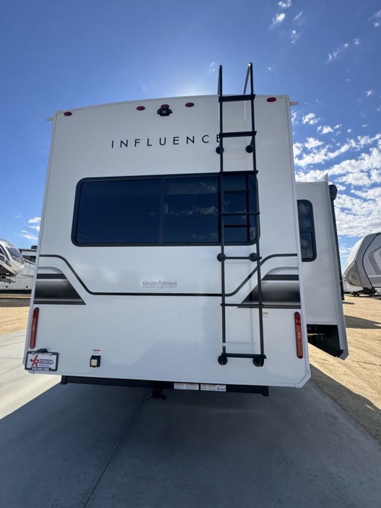 The Grand Design Influence fifth wheel RV is a luxurious and spacious home away from home. With a full profile design, this RV offers ample living space, perfect for families or those who enjoy entertaining guests. The residential attention to detail is evident throughout the RV, with features such as a gourmet kitchen, comfortable living area, and a master bedroom with a king-sized bed.