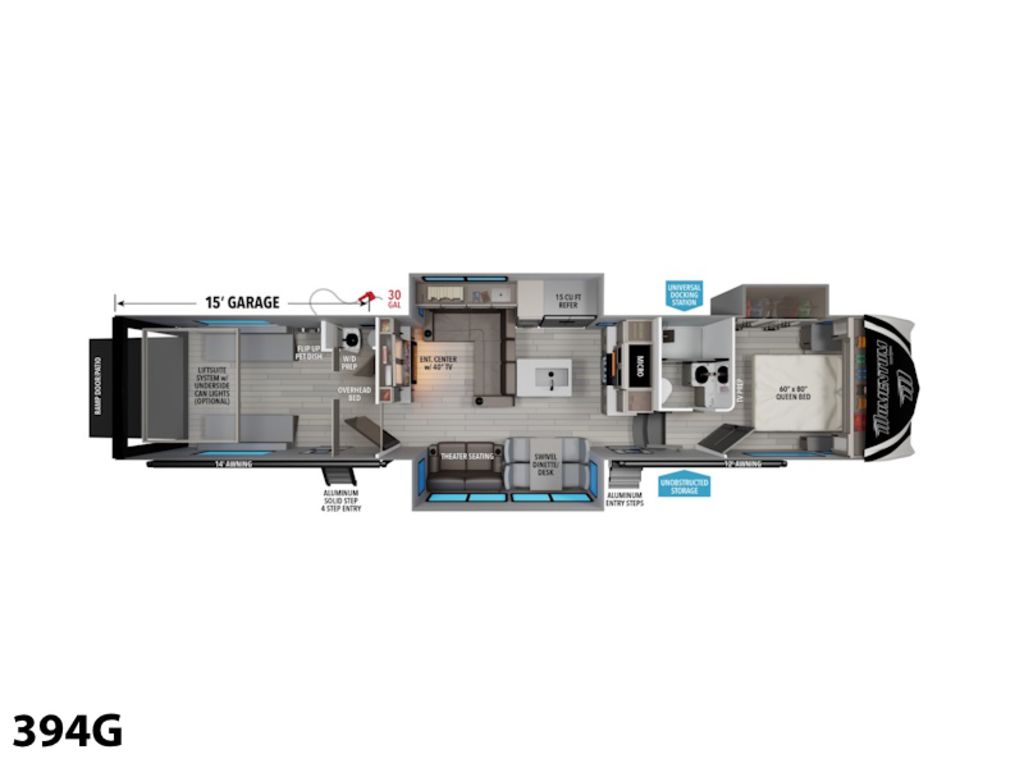 The Momentum G-Class fifth wheel from Grand Design is a perfect choice for those who want to take their outdoor adventures to the next level. Boasting superior construction, this fifth wheel is built to last with fully laminated sideboxes and an R-40 garage floor, making it durable and reliable for all types of terrain and weather conditions. The Momentum G-Class offers spacious and functional floorplans that are perfect for families who enjoy power sports and outdoor experiences. Quality craftsmanship is evident throughout, making the Momentum G-Class a luxury toy hauler that doesn't compromise on functionality.