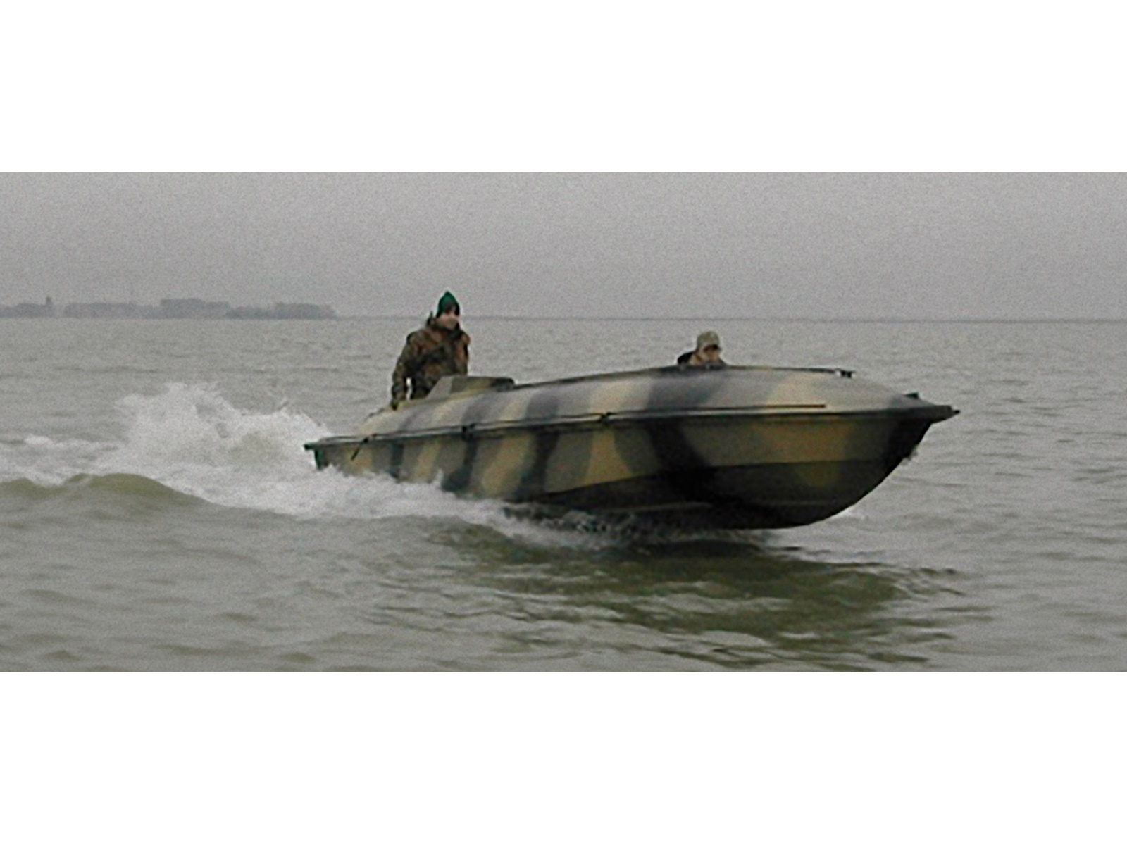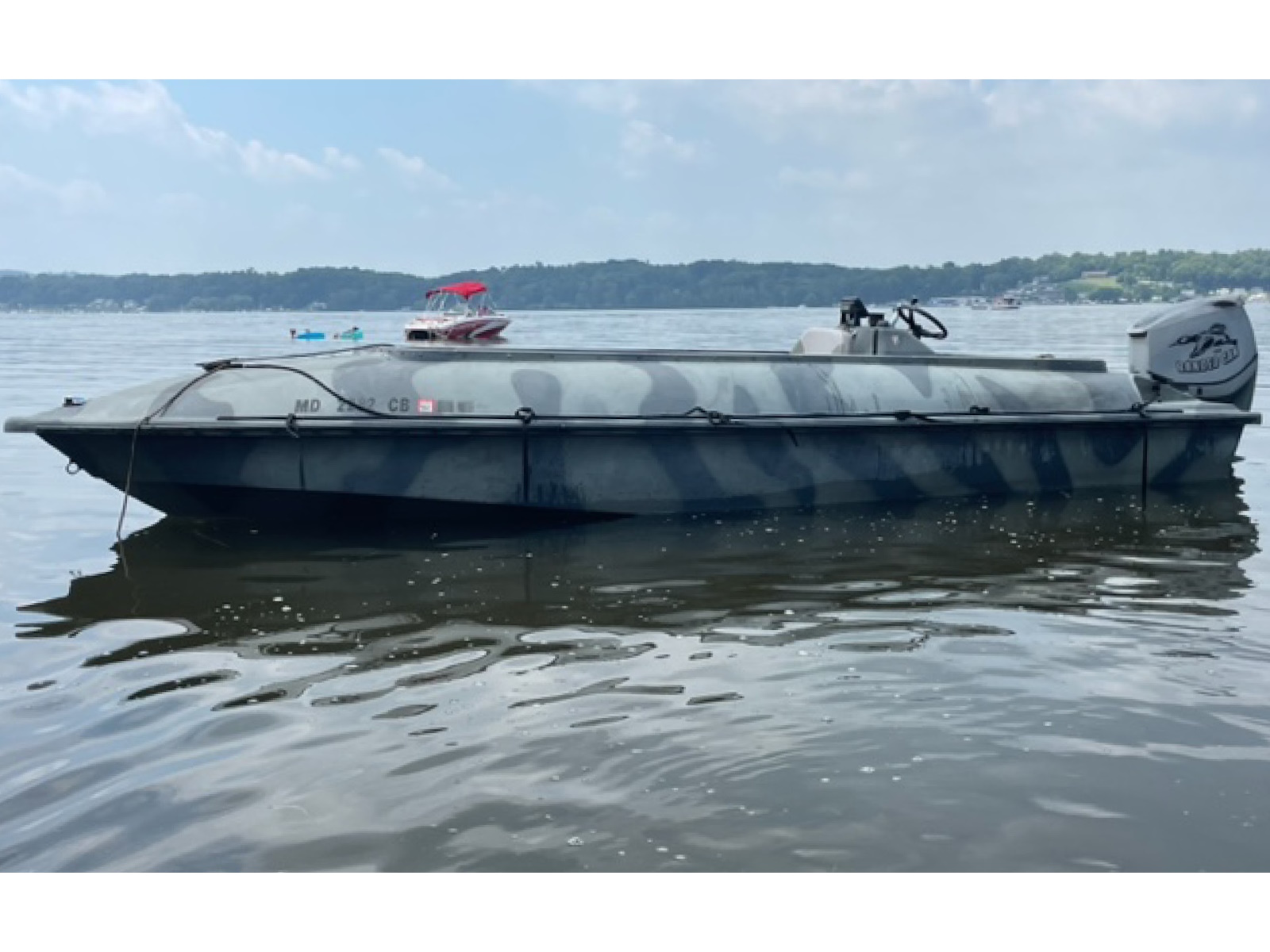 The inside of the boat is configured with decoy shelves that run down the entire length of the cockpit, upper shelves for all your smaller items, dry storage under the front deck, a side mounted console with dry storage inside of it, and a permanently mounted 25 gallon fuel tank with deck fill & gauge.