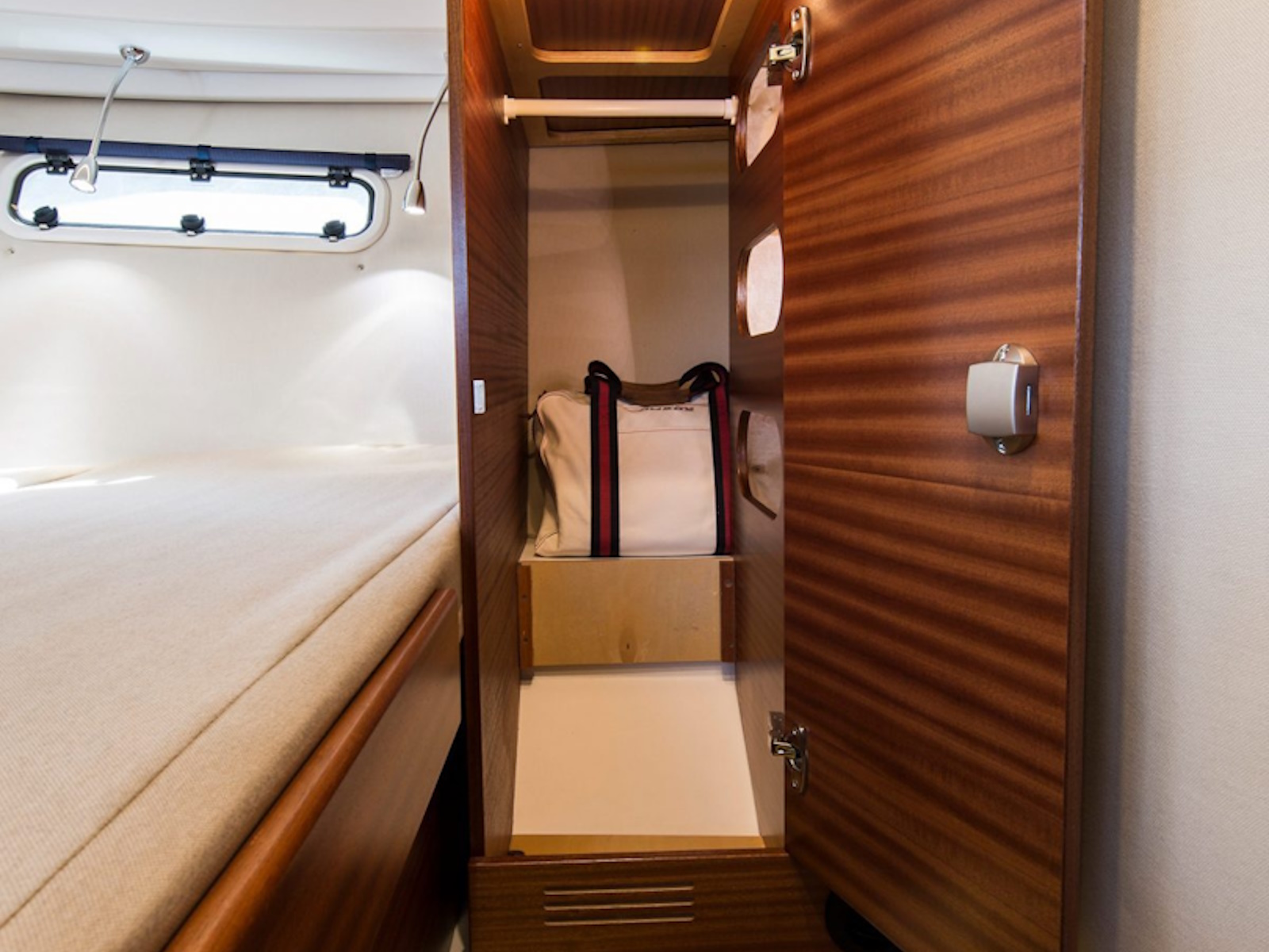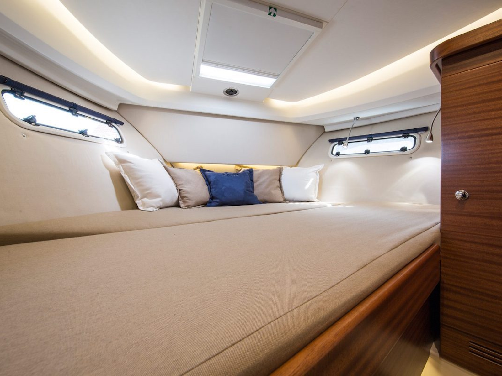 The interior of the 305 embodies wonderful quality and atmosphere, particularly in regard to space and light. The boat has integrated ventilation and five large opening port lights for extra light intake. Upholstered bulkheads in light colors help to reduce noise. The 305 has two cabins, an owner’s cabin (available with Queen bed or V-bed) and a guest cabin, sharing a common head with shower.