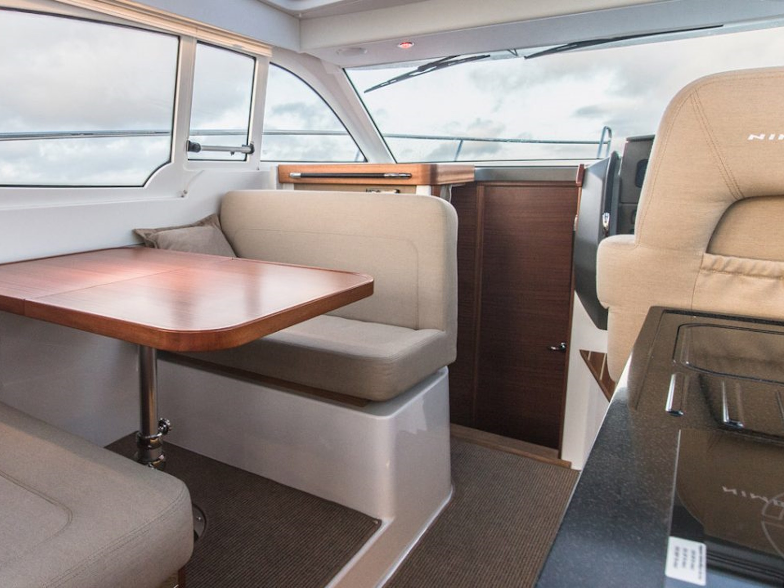 The helm has been maximized to provide the greatest possible customization and can be equipped with accessories according to individual requirements. Glued windows with a large, curved windscreen provide a great panoramic view. The salon features large flat surfaces and is both light, airy and cozy, thanks to the choice of materials and LED-lighting. The large glass roof and roof hatches provide a flood of natural light in the salon. A dinette provides plenty of room for four people to share a meal, but also converts easily into a double berth. The dining table can also fold down into a cocktail table with glass holders, making the salon a perfect place for socializing. The galley is well-equipped with ceramic gas heated glass hob with integrated ventilation, Corian top, 65-liter refrigerator and extra refrigerator/freezer box below the sofa on option.