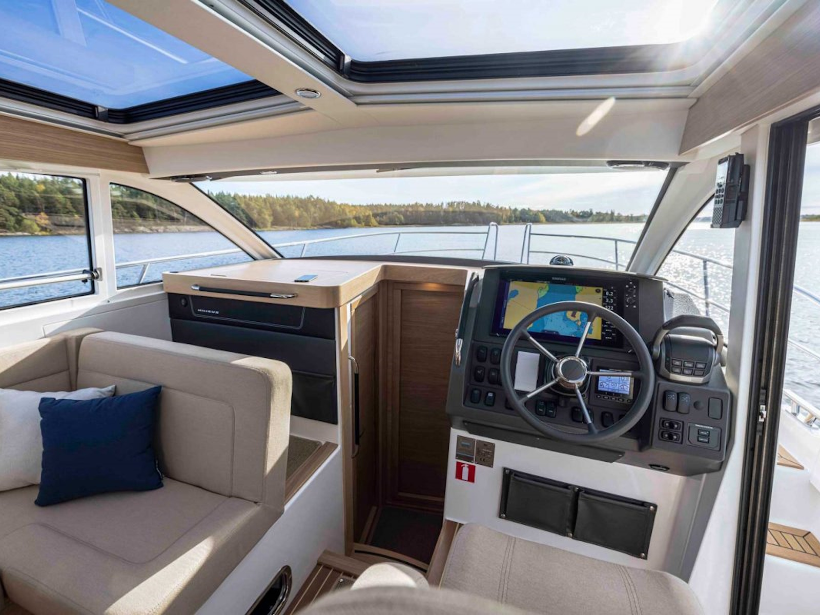 Examples of this functional and improved design are a stronger bumper list, improved visibility from the helm position and salon, a new D-pillar with integrated ventilation, double sunroofs allowing for more natural light in the salon, an extended aft roof for better shelter and easier canopy handling, a new, improved side door and redesigned pulpits with improved functionality and safety.