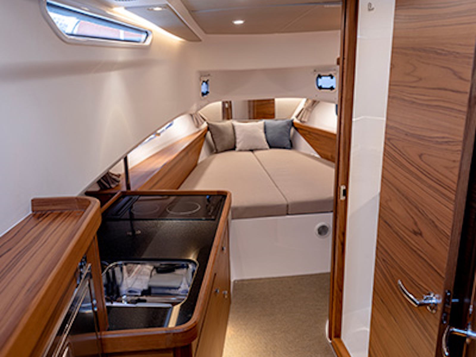 The high ceiling height and natural lighting in the salon combined with fully opened side doors, open stern door and fully opened roof hatches gives the feel of an open boat.