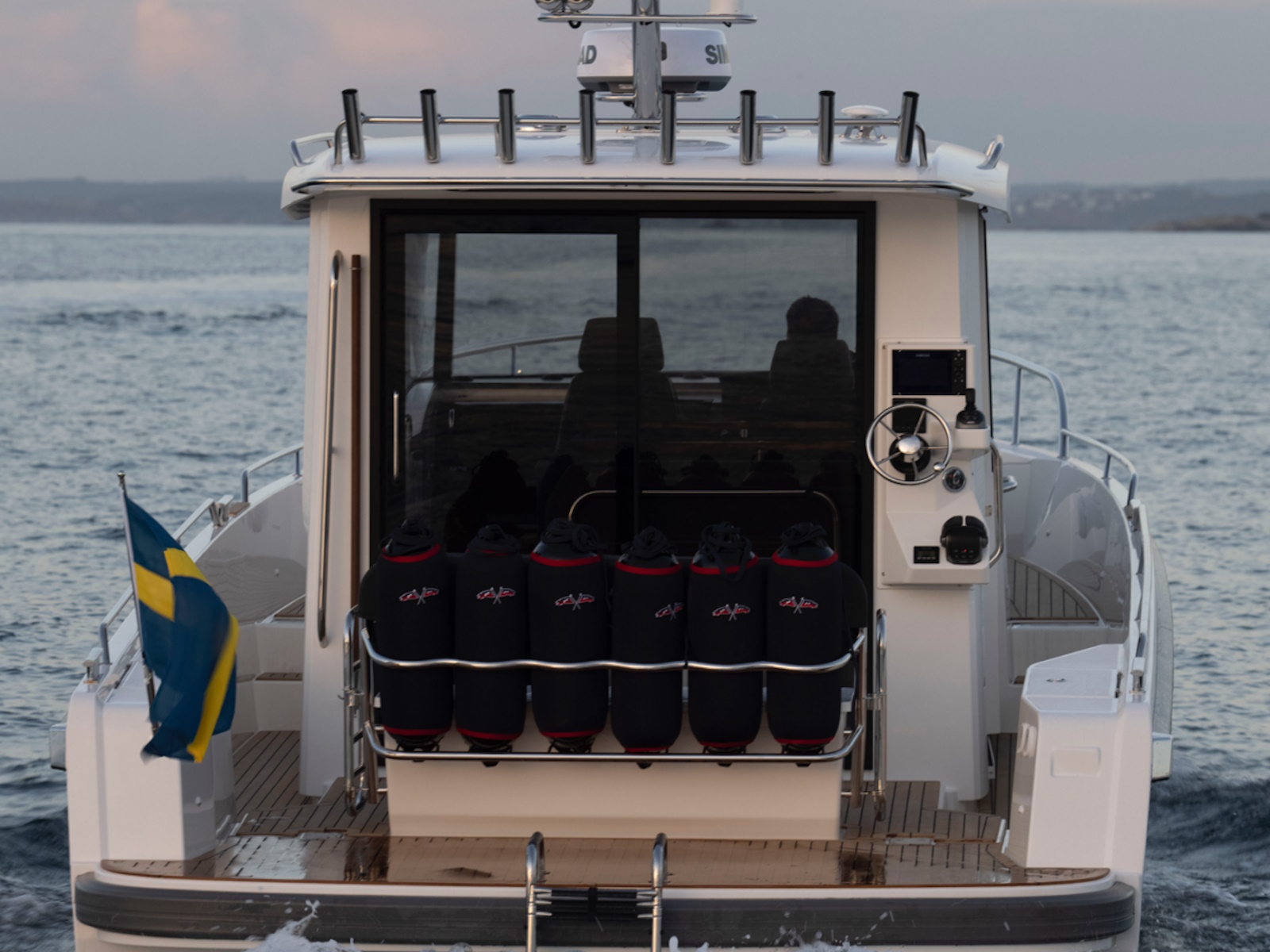 The large aft deck can be used as a load surface and has a folding bench with fender holders. The aft deck holds an easily accessible storage space that measures 2500 liters intended for gear, tools and luggage. The swim platform and aft deck are well sized and can easily accommodate several people at the same time. There is an option of an extra external helm with plotter and joystick on the starboard aft deck.