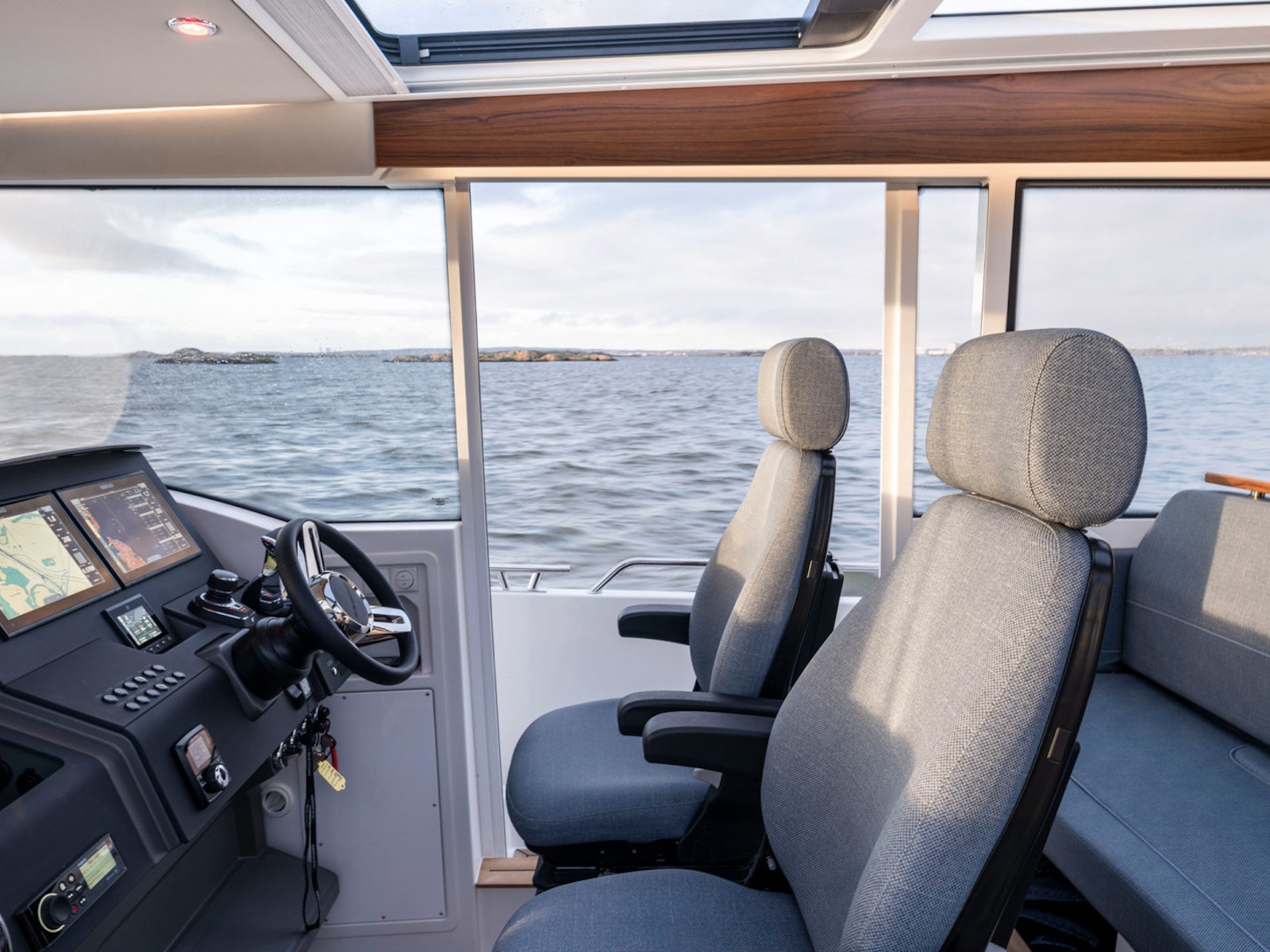 The helm seats two people in typical snug Nimbus manner and has plenty of storage compartments. As a driver you can choose to stand or sit while driving. The dashboard has space for two 12-inch plotters. Options include professional suspension seats and joystick steering.