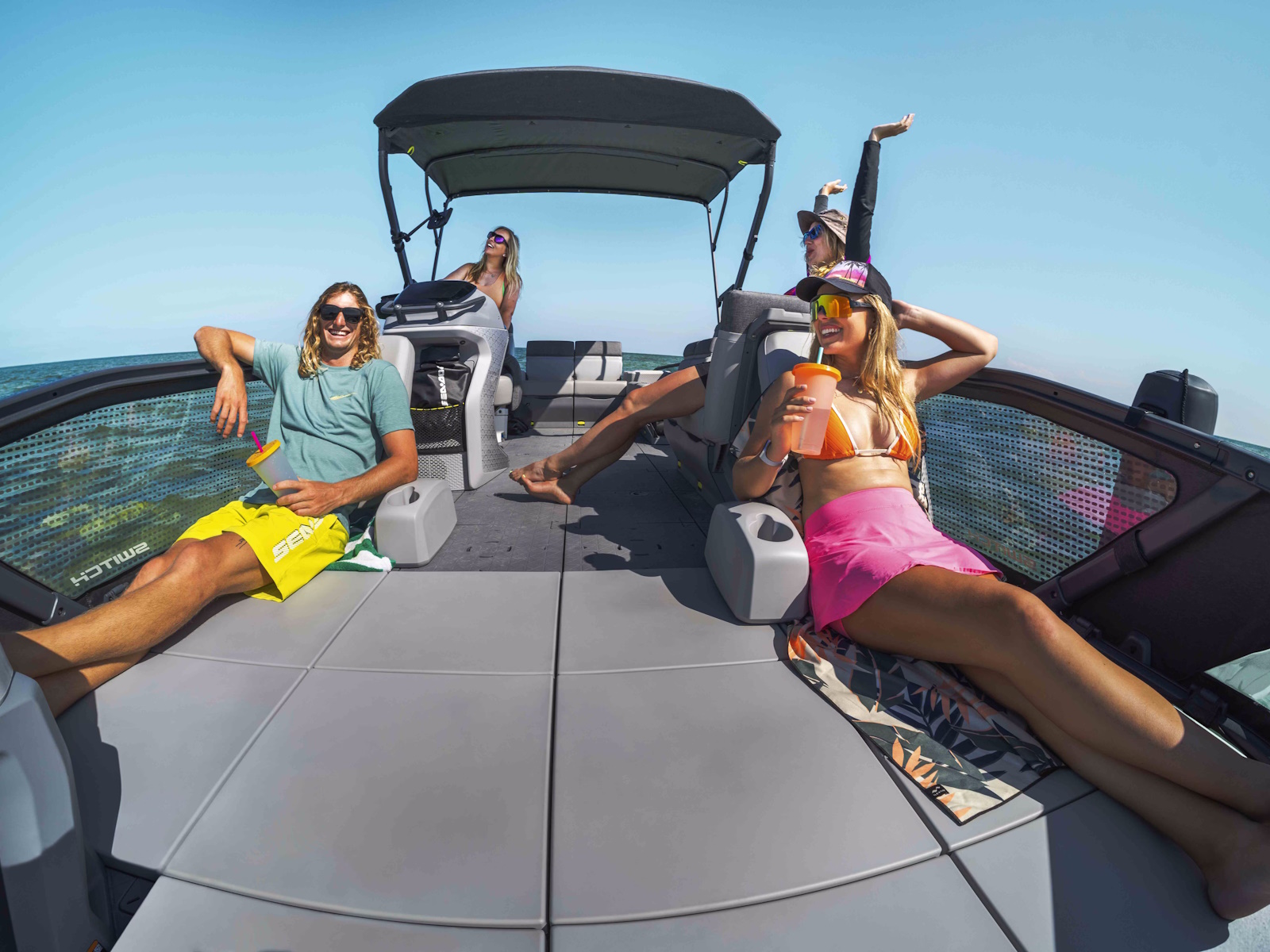 - Sit, stretch out or sunbathe in ultimate comfort with padded flooring and backrests in the front lounge area. Clear-view side panels let you take in the action with a unique proximity to the water.
