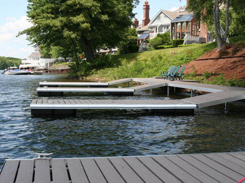 Shore Side Docks Floating dock proudly rides atop the water finished with our drop-in decking design that provides that great clean deck and side rail for a beautiful, easy to maintain (and enjoy) dock system.