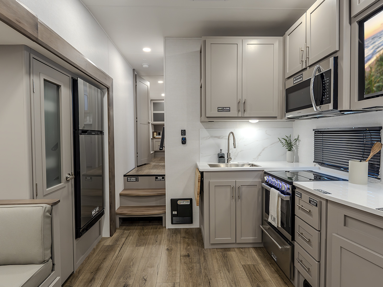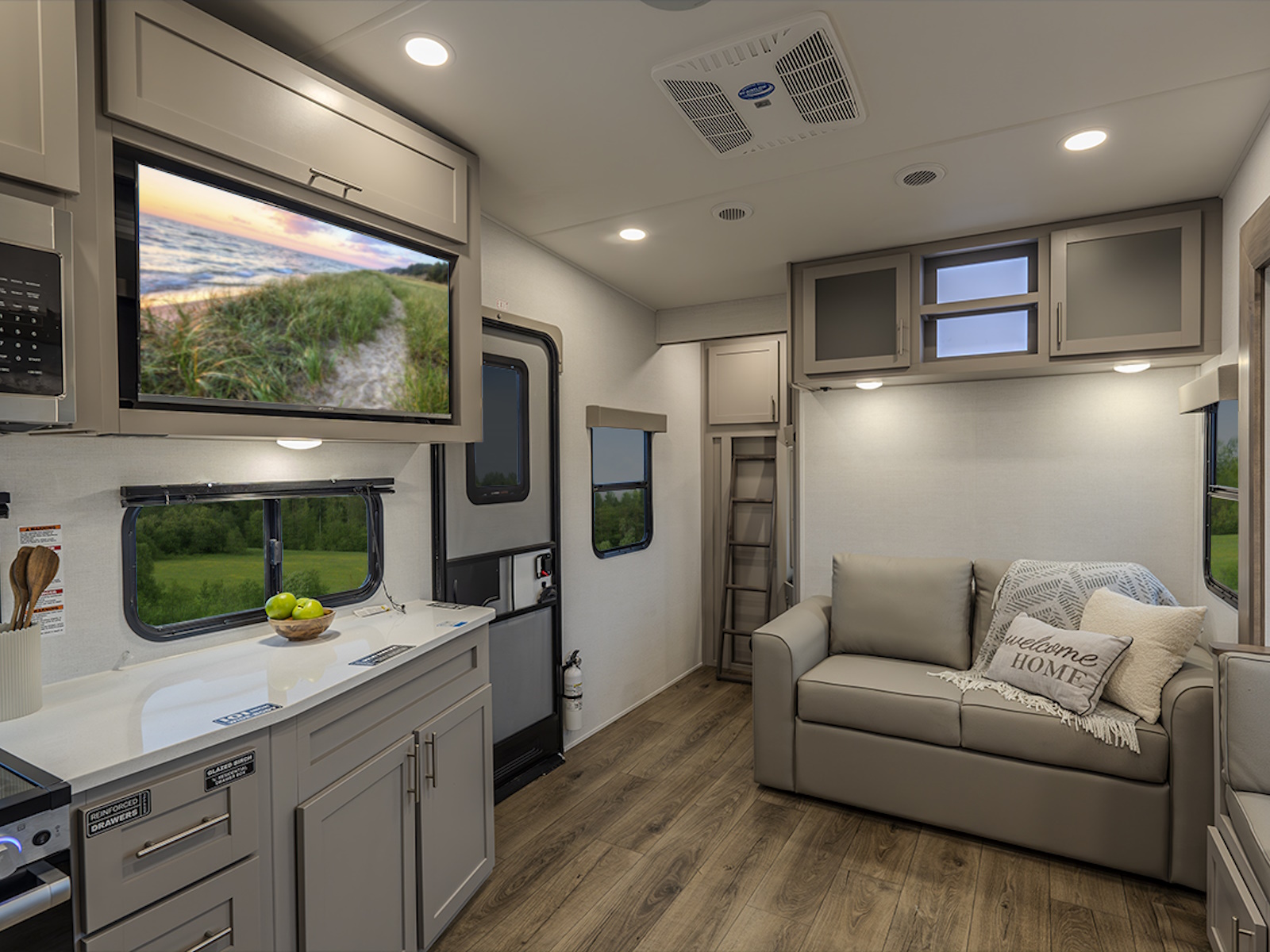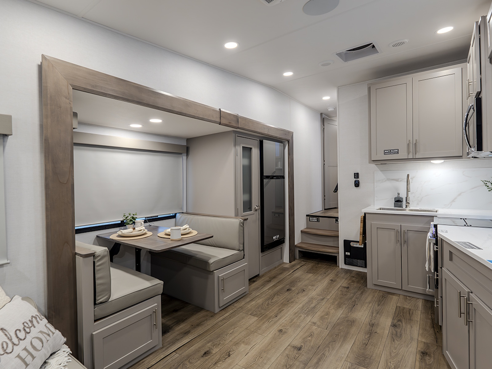 This RV is built for durability. With a benchmark chassis, Azdel composite sidewalls, and a seamless PVC roof, this RV is durable and low-maintenance. The no carpet zone with vinyl flooring makes cleaning easy and pet-friendly. Plus, flush slide-out floors provide extra space and safety.