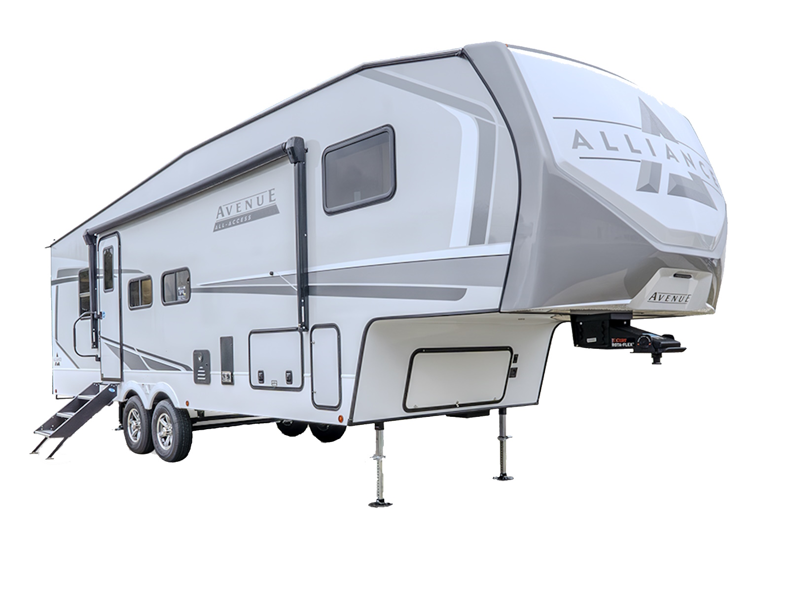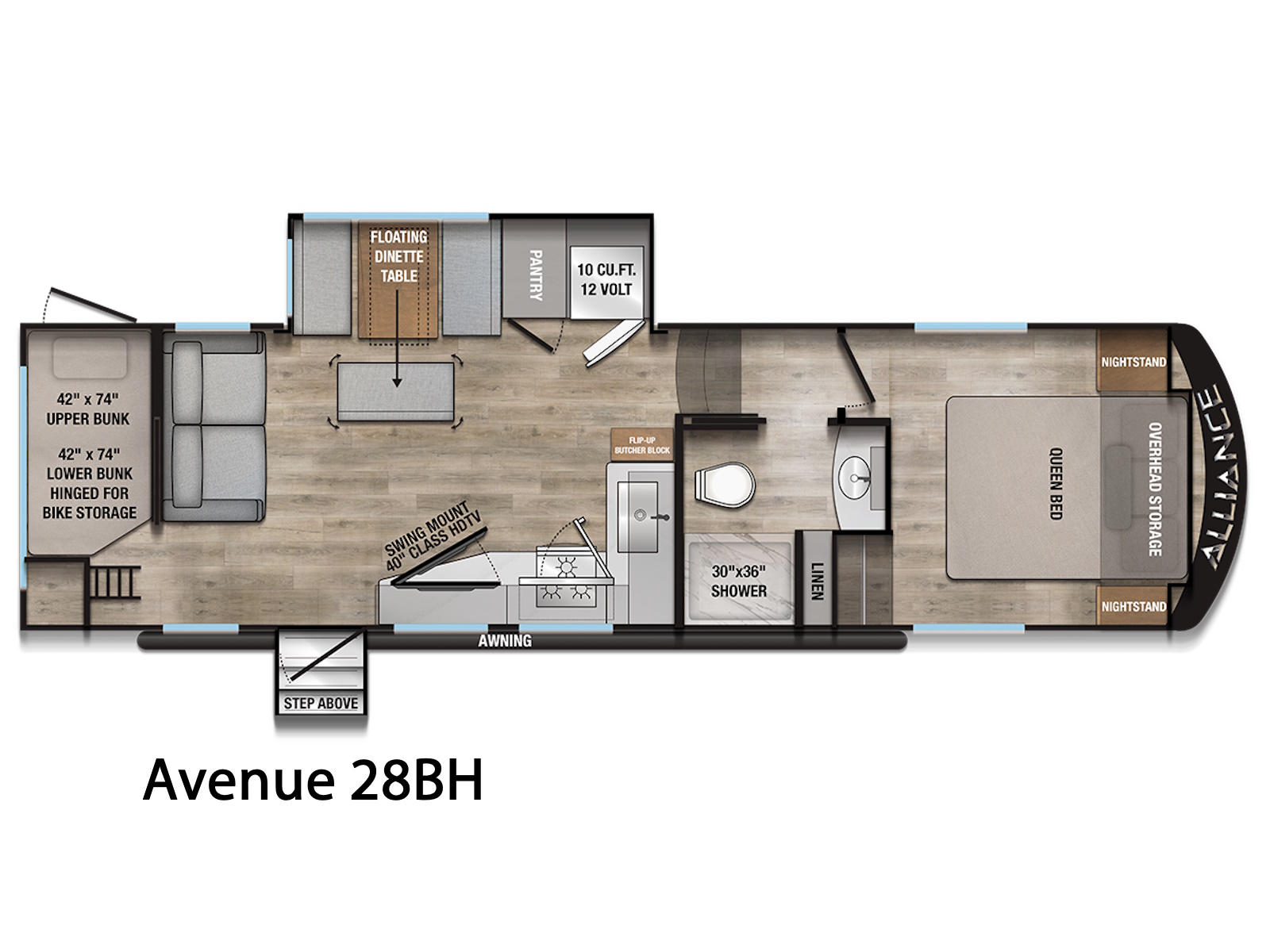 The Avenue 28BH is the perfect family fifth wheel, featuring bunk beds with accessible storage, a spacious living area, and a side-aisle bath with a 30" x 36" shower. The kitchen includes a 10 cu. ft. 12V refrigerator and pantry, with extra seating and a swing mount 40" HDTV for entertainment. The private front bedroom offers a queen bed and wardrobe for your convenience.