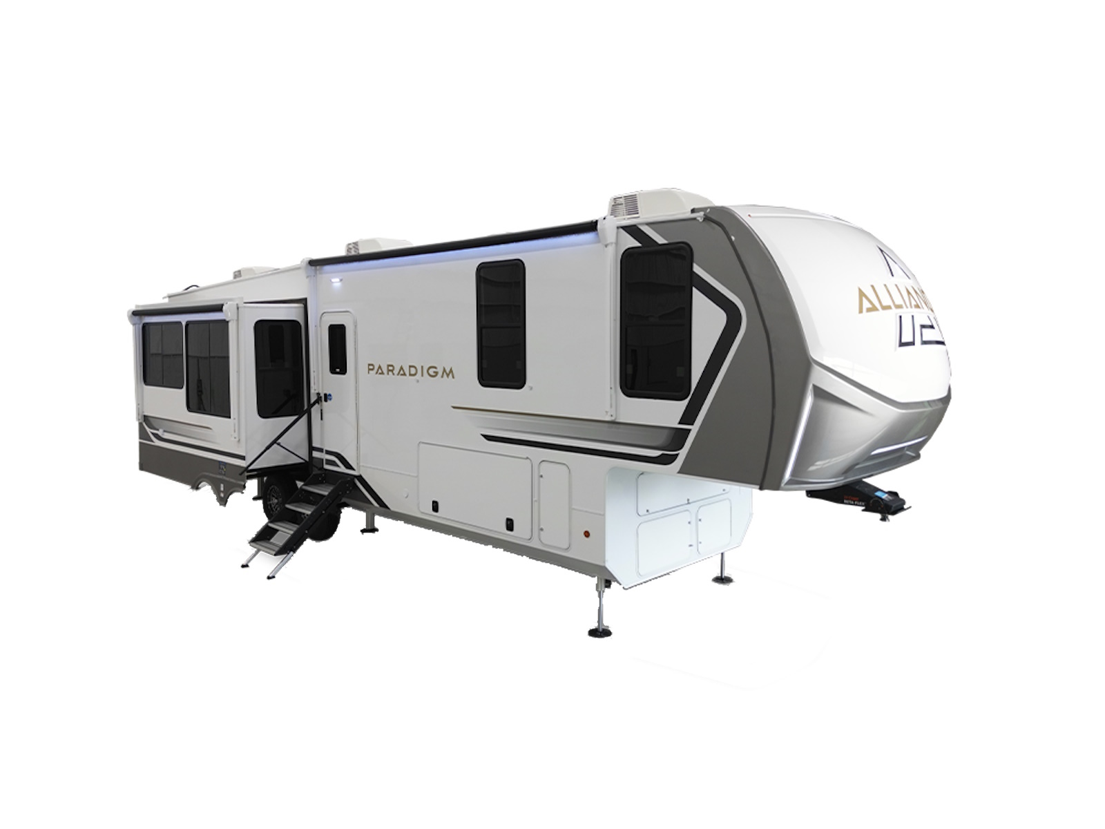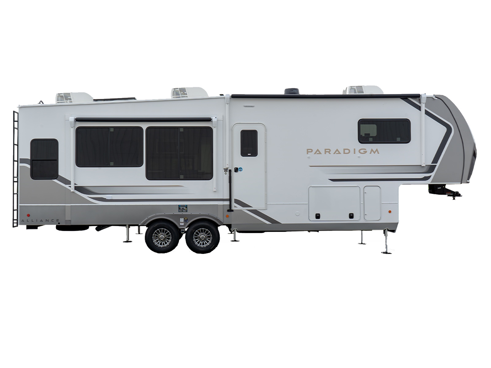 The Alliance RV Paradigm 340RL fifth wheel is designed to elevate your travel experience, whether you're visiting family and friends or exploring new destinations. This luxurious RV features a spacious rear living area with dual opposing slides, providing ample space for both comfort and entertainment. Relax on the dual recliner love seat, enjoy the warmth of the fireplace, or watch your favorite shows on the 50" Smart TV. Behind the TV, you’ll find hidden pantry storage, maximizing space while keeping your essentials within reach.