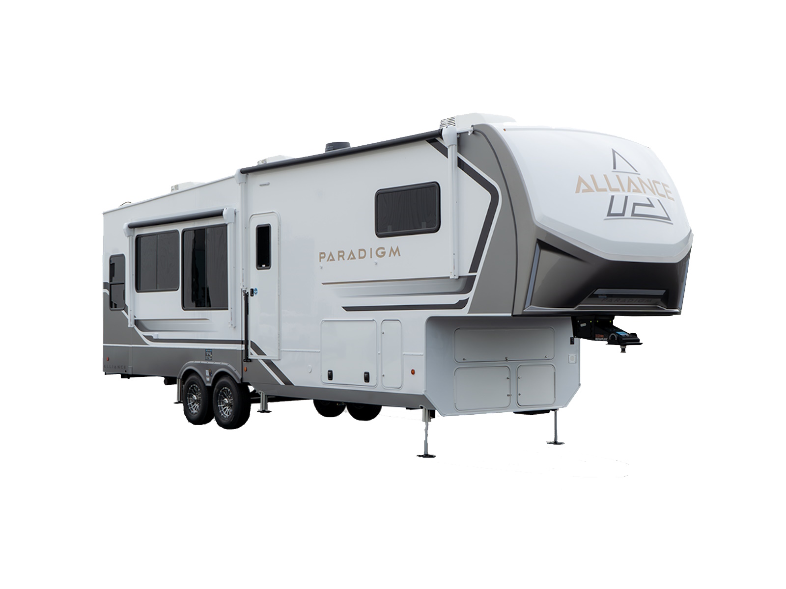 The Alliance RV Paradigm 340RL fifth wheel is designed to elevate your travel experience, whether you're visiting family and friends or exploring new destinations. This luxurious RV features a spacious rear living area with dual opposing slides, providing ample space for both comfort and entertainment. Relax on the dual recliner love seat, enjoy the warmth of the fireplace, or watch your favorite shows on the 50" Smart TV. Behind the TV, you’ll find hidden pantry storage, maximizing space while keeping your essentials within reach.