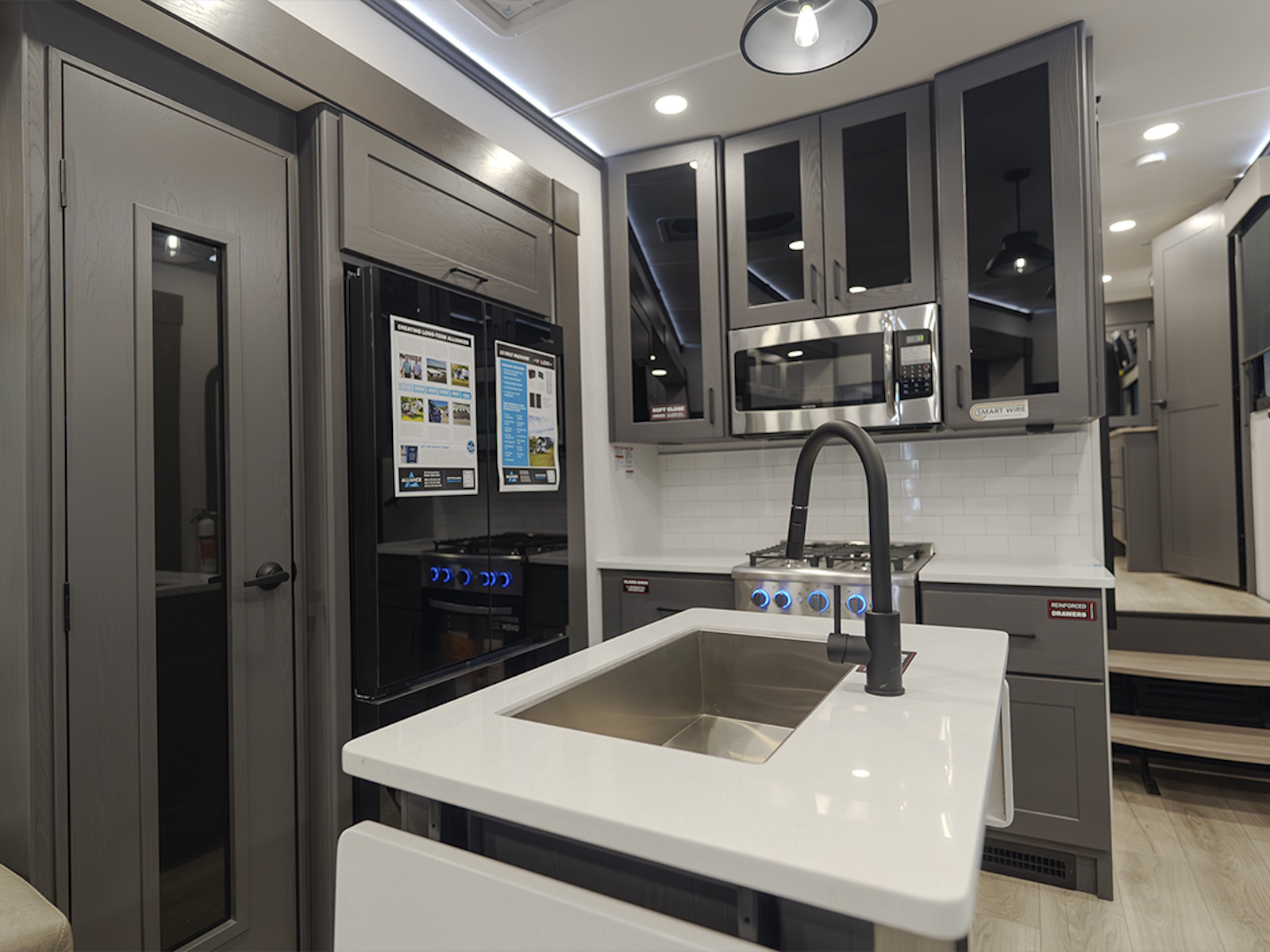 Inside, enjoy hardwood cabinetry, solid surface countertops, and commercial-grade vinyl flooring—easy to clean and perfect for rugged use. The Valor 42V14 also features 12V charging stations and a stainless steel refrigerator, making it easier than ever to stay powered and comfortable on your adventures.