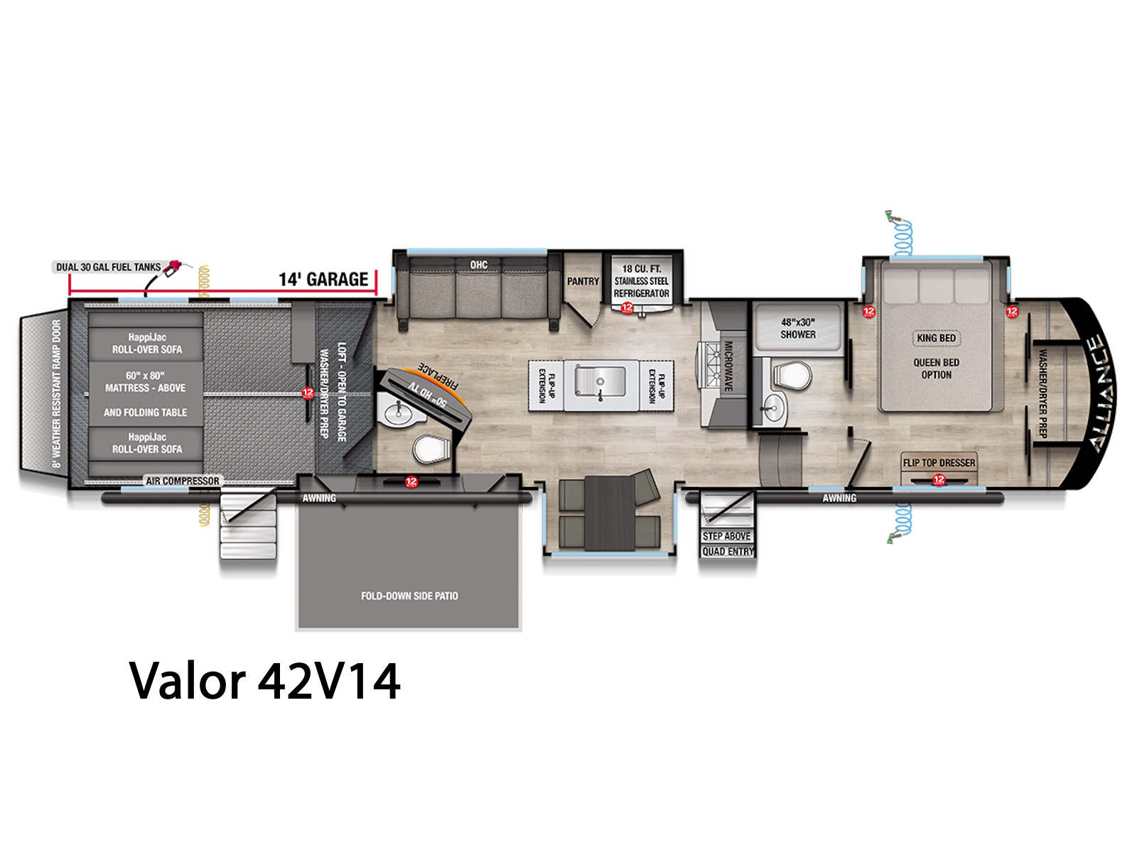 The Valor 42V14 toy hauler combines comfort and adventure in one impressive package. With a 14' garage and an 8' weather-resistant ramp door, loading and unloading your toys is simple. The garage also includes HappiJac sofas and a drop-down queen bed for extra sleeping, along with a loft for added storage or sleeping space. A convenient half bathroom is also located in the garage area.