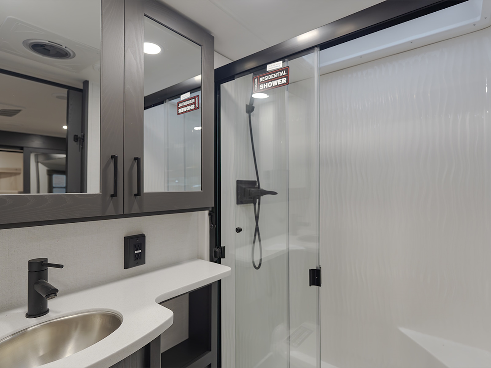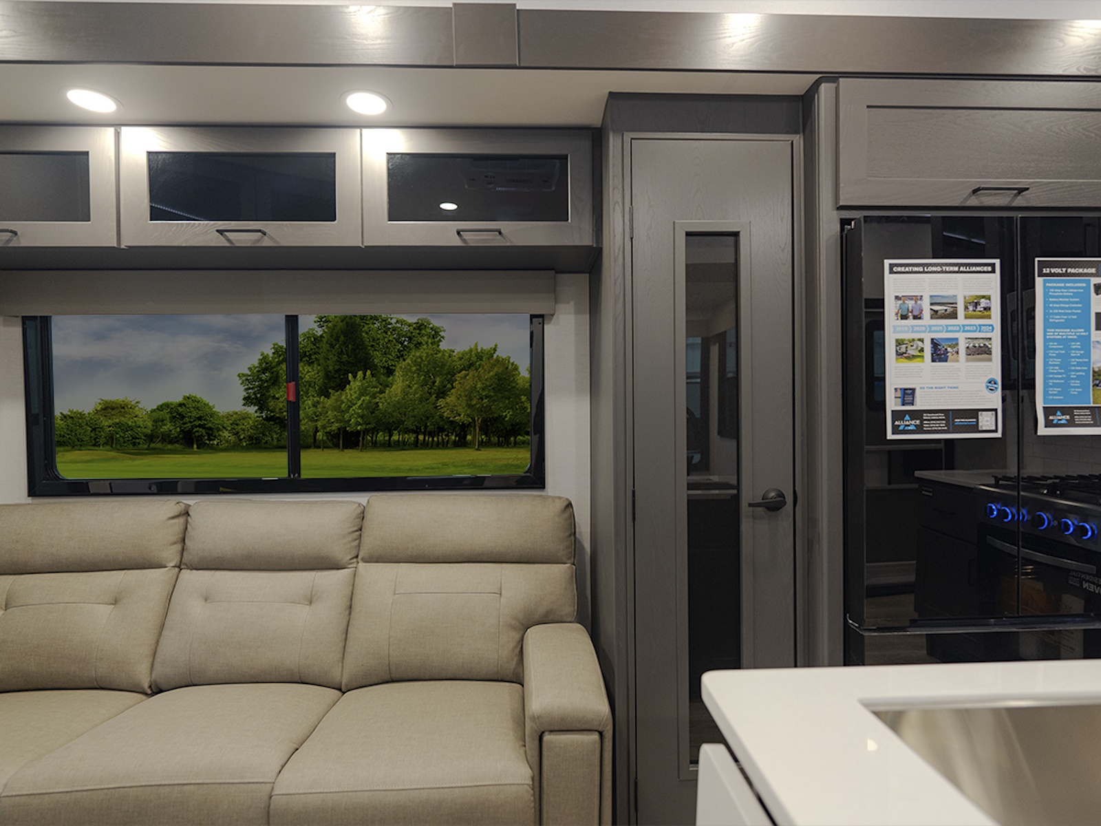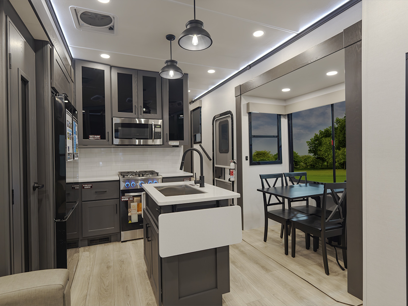 Inside, enjoy hardwood cabinetry, solid surface countertops, and commercial-grade vinyl flooring—easy to clean and perfect for rugged use. The Valor 42V14 also features 12V charging stations and a stainless steel refrigerator, making it easier than ever to stay powered and comfortable on your adventures.