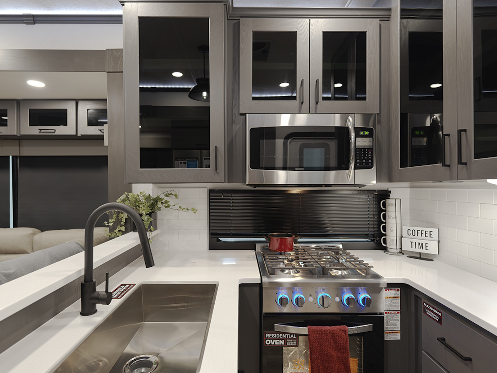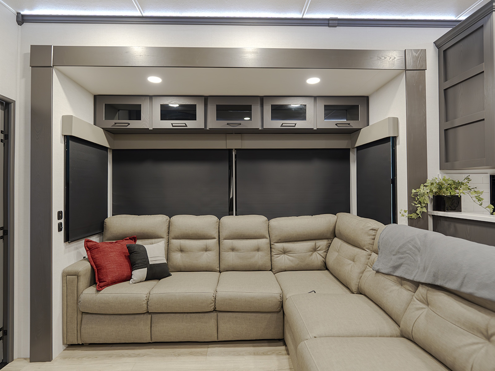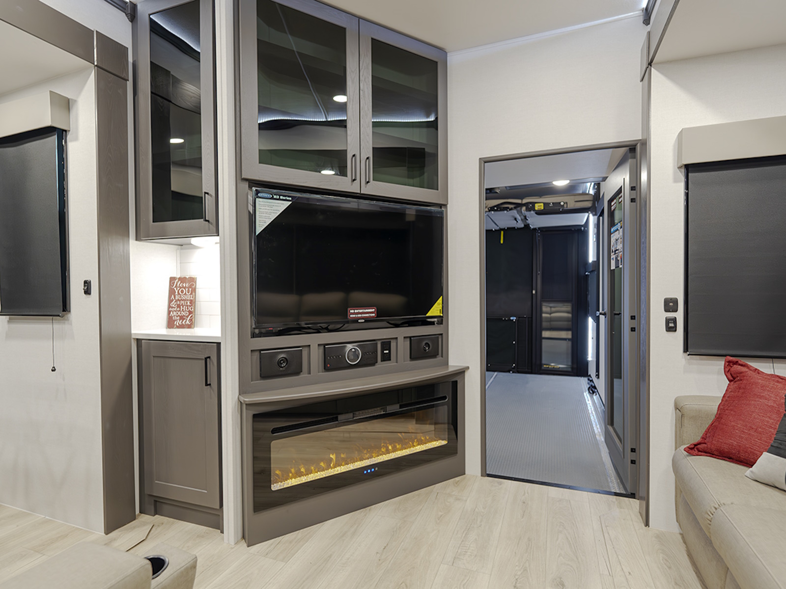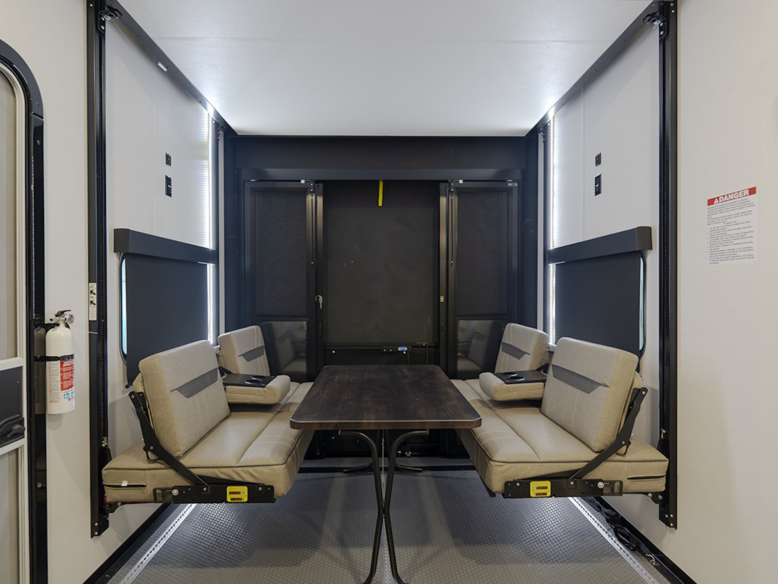 The chef in the family will love the fully equipped kitchen, featuring a three-burner cooktop, a 17 cu. ft. stainless steel 12V refrigerator, a large sink, and ample countertop space for meal prep. The L-shaped sofa slide provides plenty of space for relaxation, while you unwind with the 50" HDTV and fireplace. Enjoy family meals or game nights at the dining table with four chairs, making this the perfect place to gather after a day of adventure.