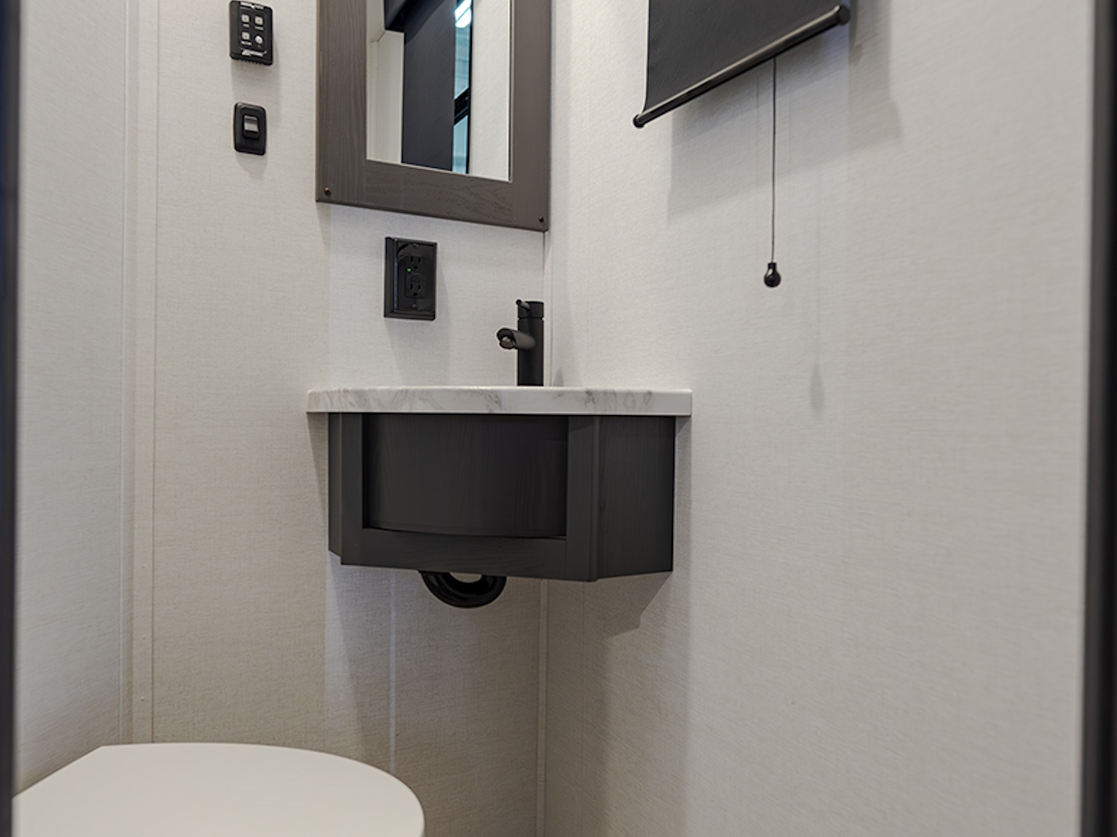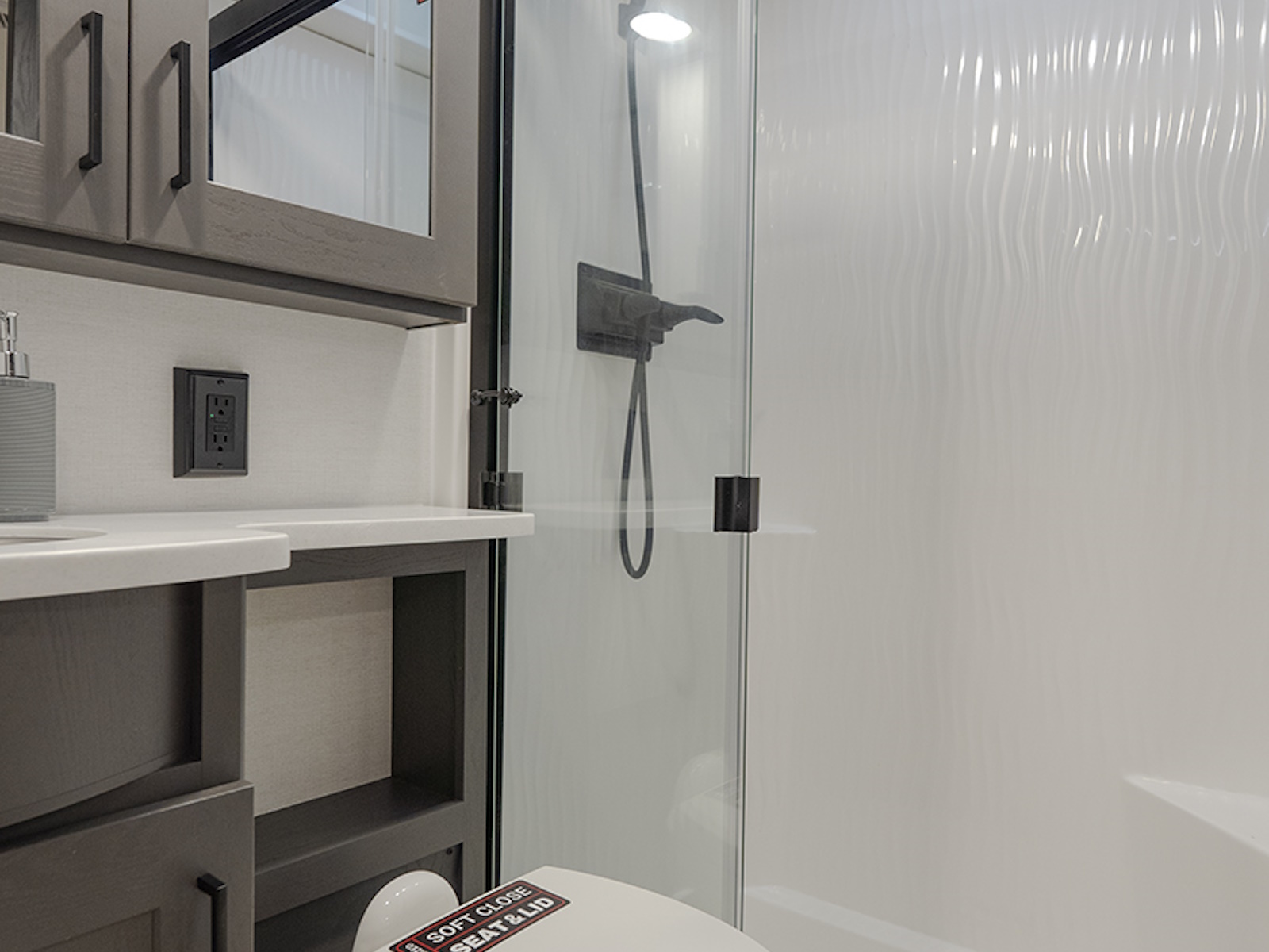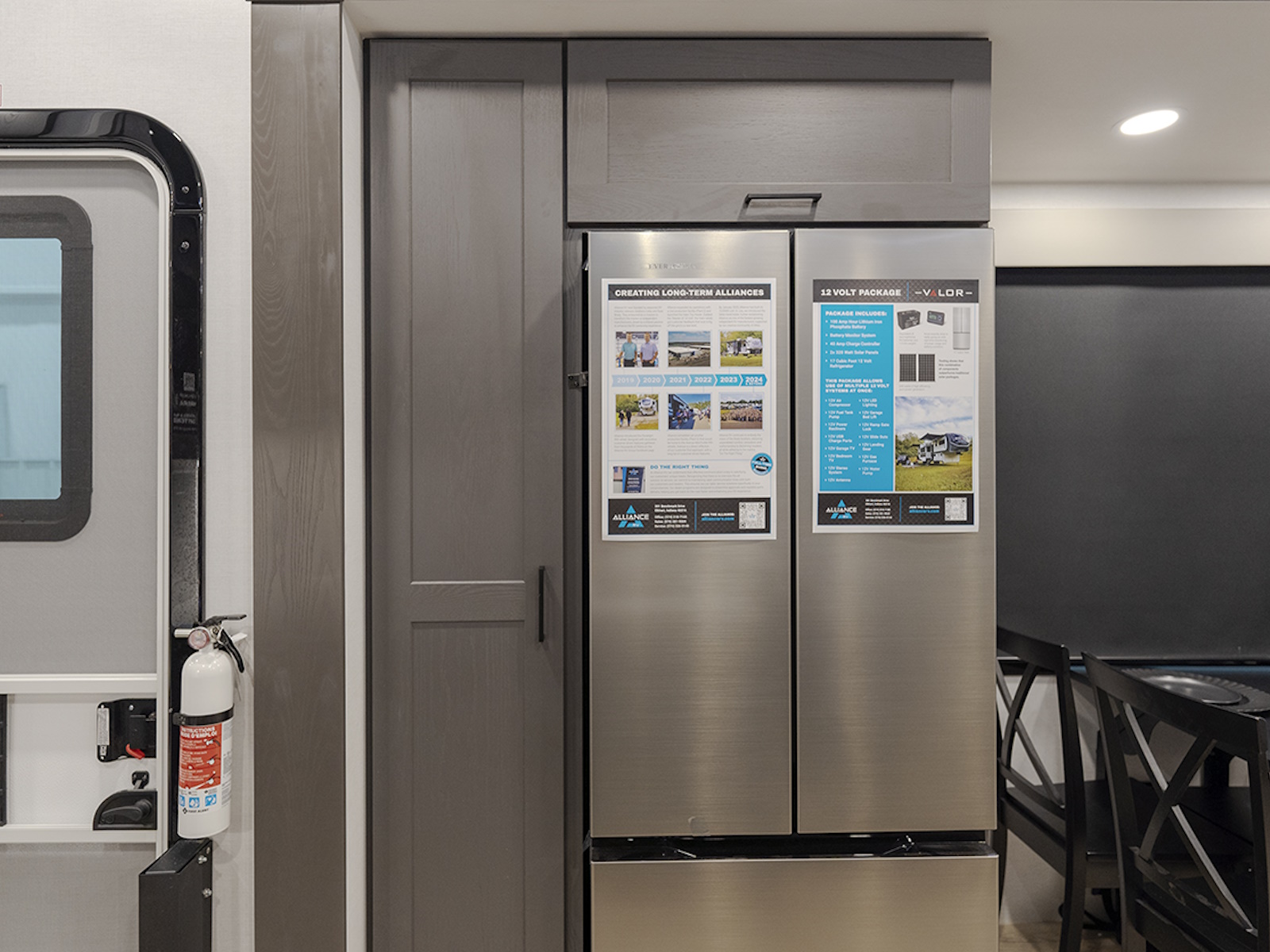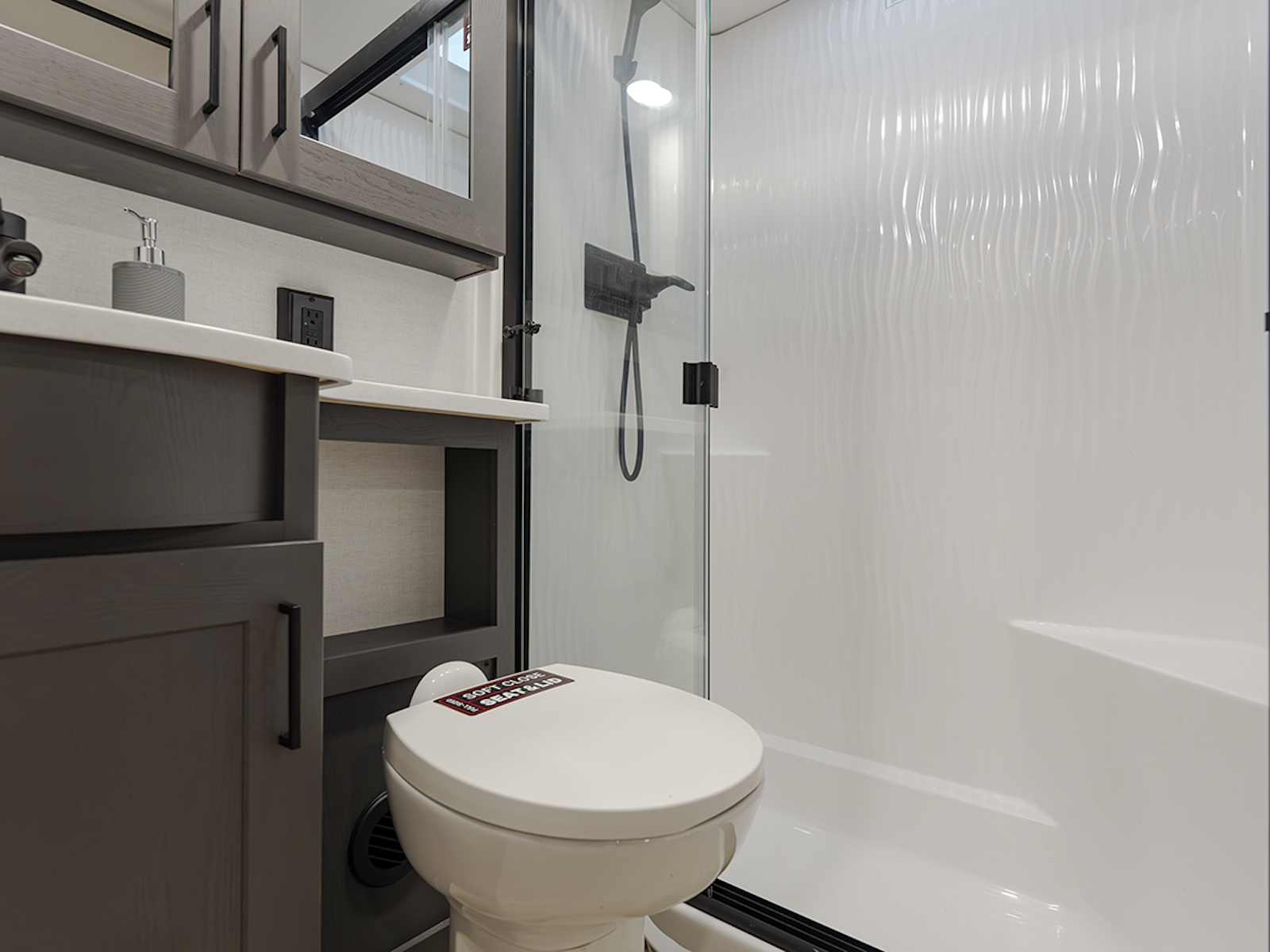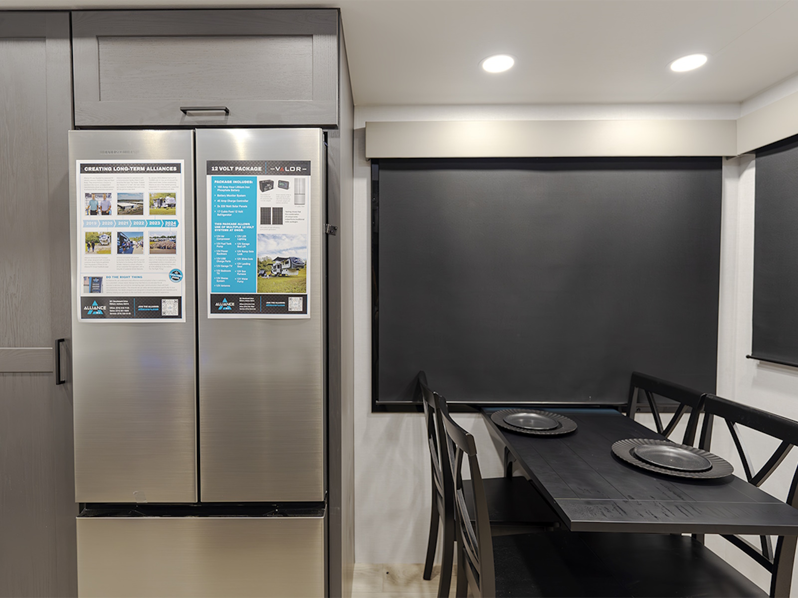 The chef in the family will love the fully equipped kitchen, featuring a three-burner cooktop, a 17 cu. ft. stainless steel 12V refrigerator, a large sink, and ample countertop space for meal prep. The L-shaped sofa slide provides plenty of space for relaxation, while you unwind with the 50" HDTV and fireplace. Enjoy family meals or game nights at the dining table with four chairs, making this the perfect place to gather after a day of adventure.