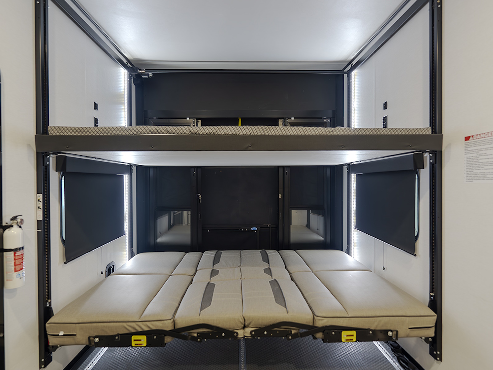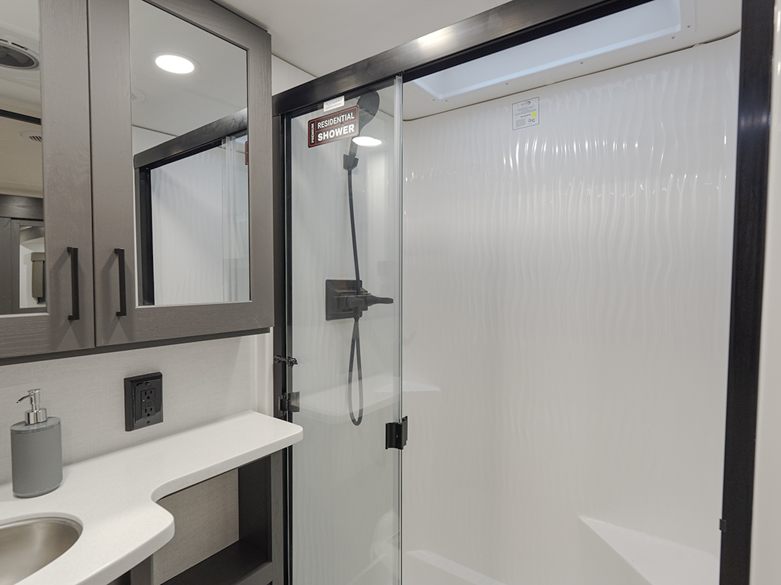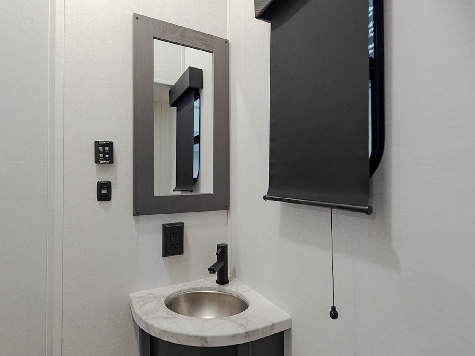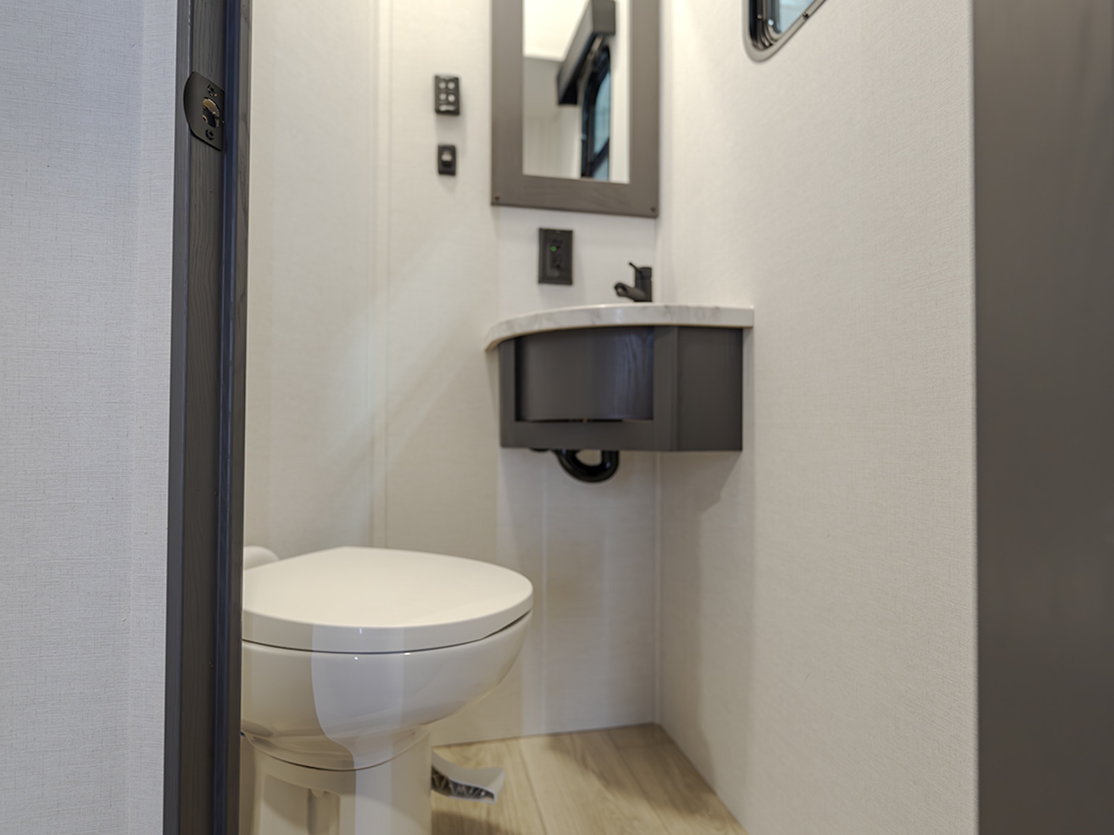 The chef in the family will love the fully equipped kitchen, featuring a three-burner cooktop, a 17 cu. ft. stainless steel 12V refrigerator, a large sink, and ample countertop space for meal prep. The L-shaped sofa slide provides plenty of space for relaxation, while you unwind with the 50" HDTV and fireplace. Enjoy family meals or game nights at the dining table with four chairs, making this the perfect place to gather after a day of adventure.