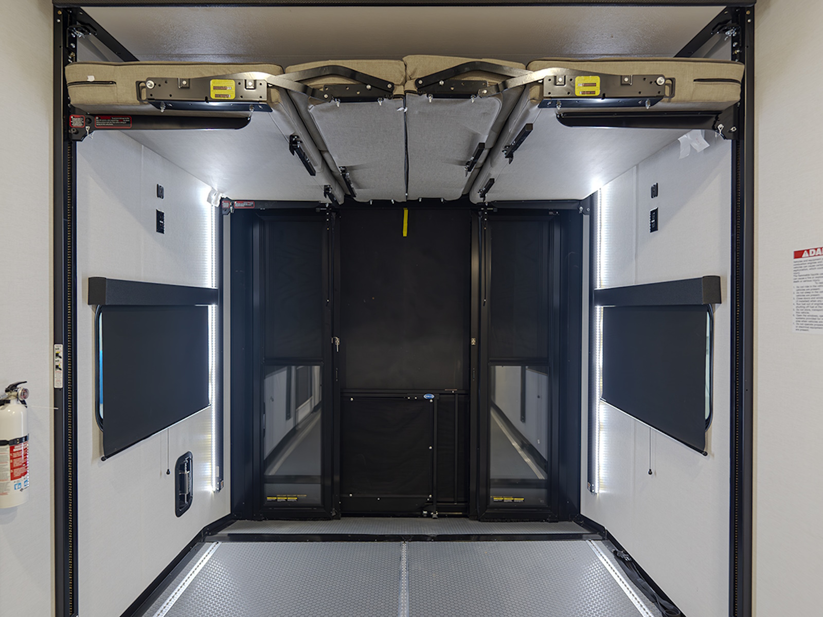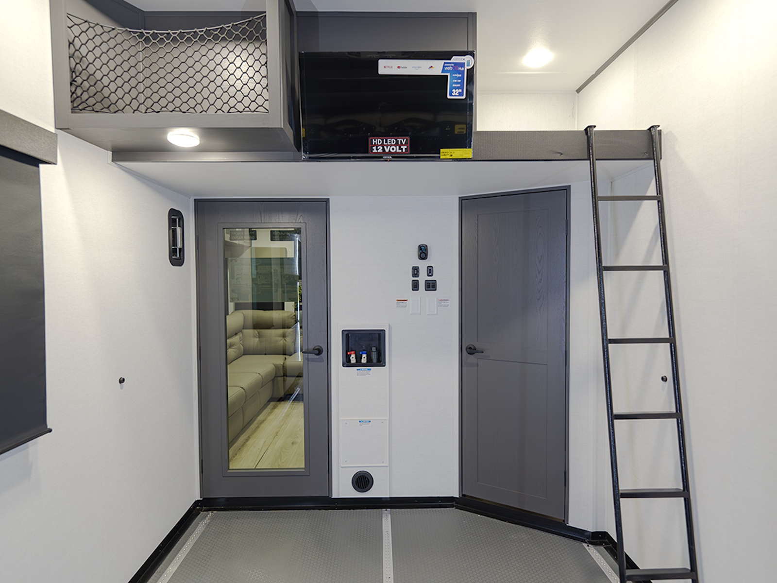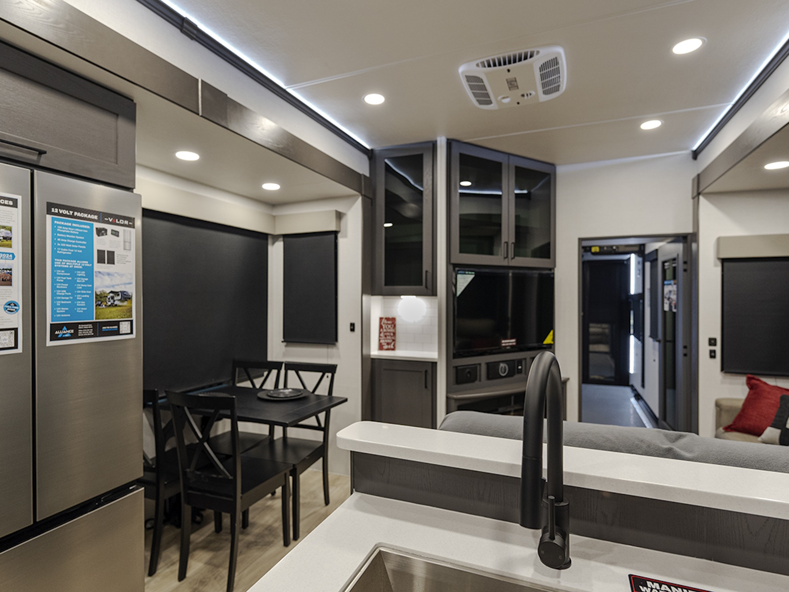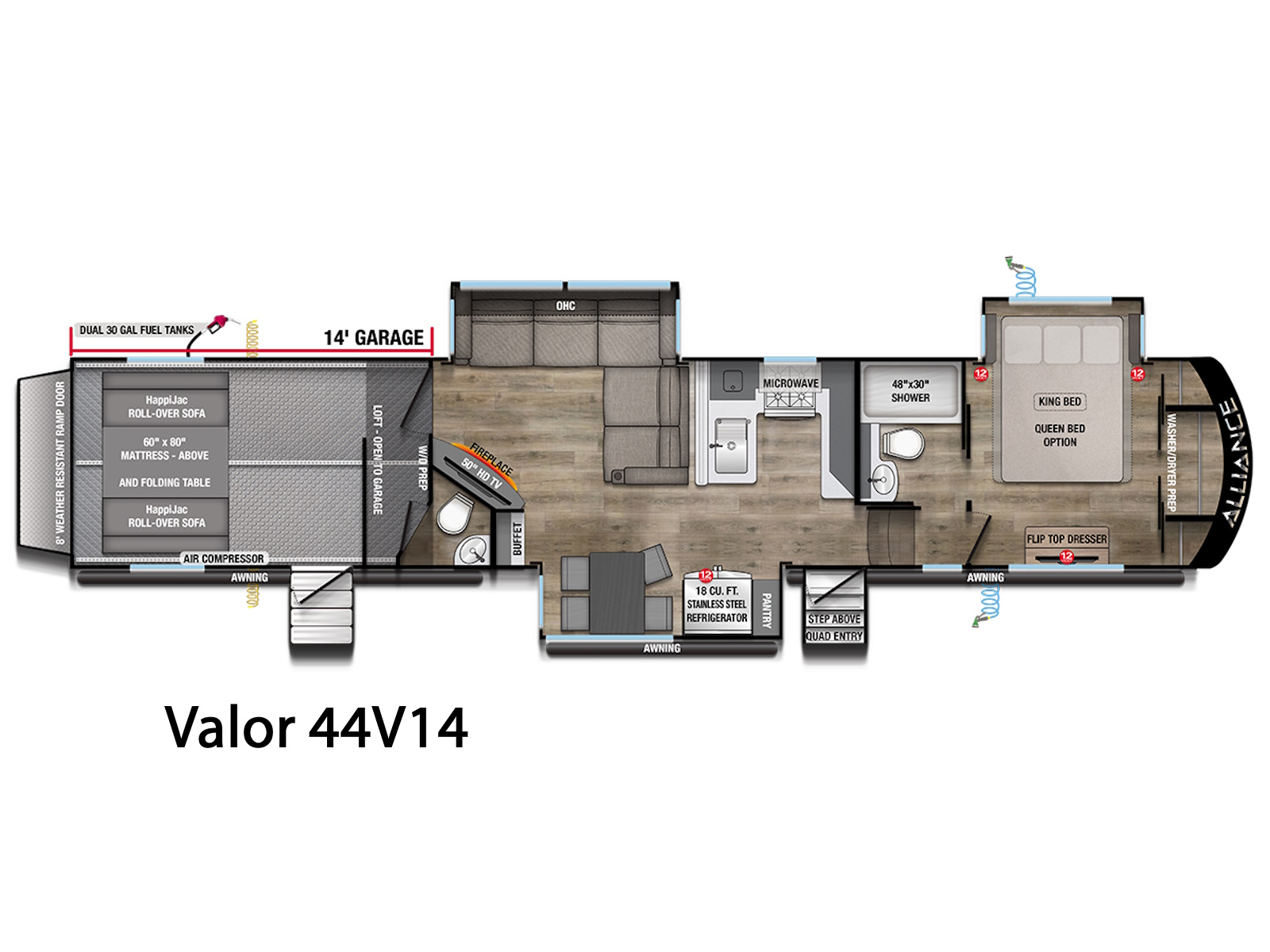 The Valor 44V14 toy hauler is perfect for large groups and families looking for space, comfort, and adventure. With 14' of garage space, you have plenty of room for your toys and gear, plus easy access through the dual entry doors. Once you’ve unloaded, the garage area offers HappiJac roll-over sofas with a drop-down queen bed for extra sleeping, and a loft that opens to the garage for even more room or a fun sleeping nook. The half bath off the garage adds extra convenience, keeping everyone out of the main living area when they need a quick bathroom break.