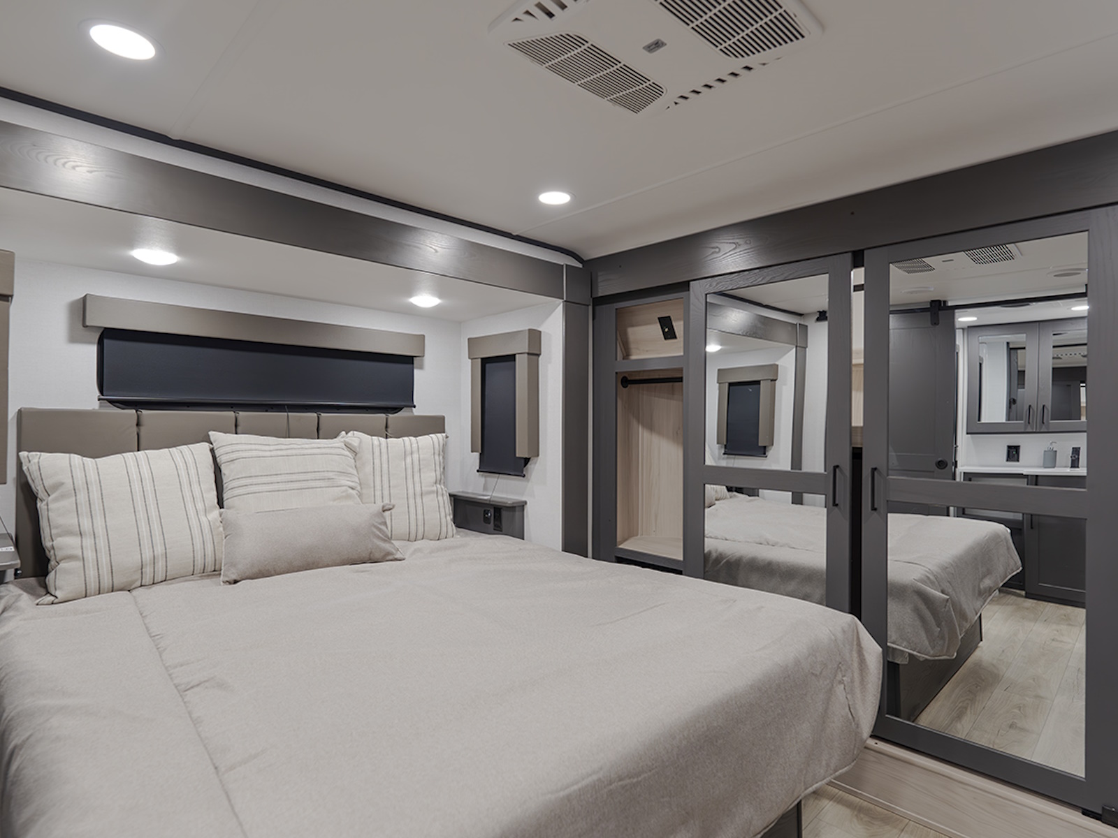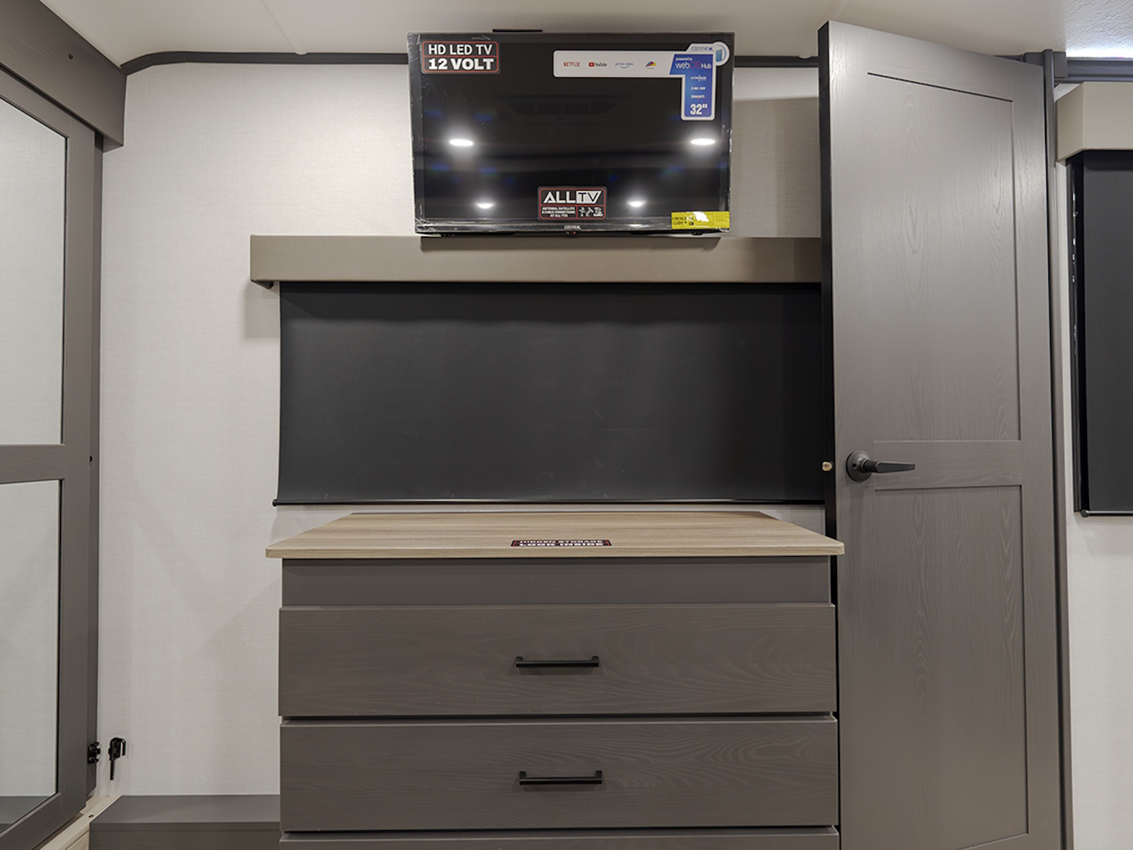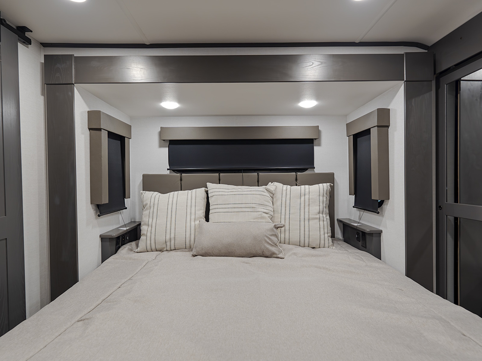 The front private bedroom offers a king bed slide for added space and comfort, plus a flip-top dresser and large front wardrobe that's prepped for a washer/dryer. The dual entry bathroom ensures easy access from both the bedroom and the main living area.