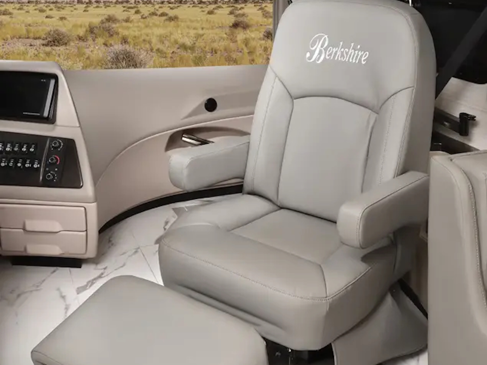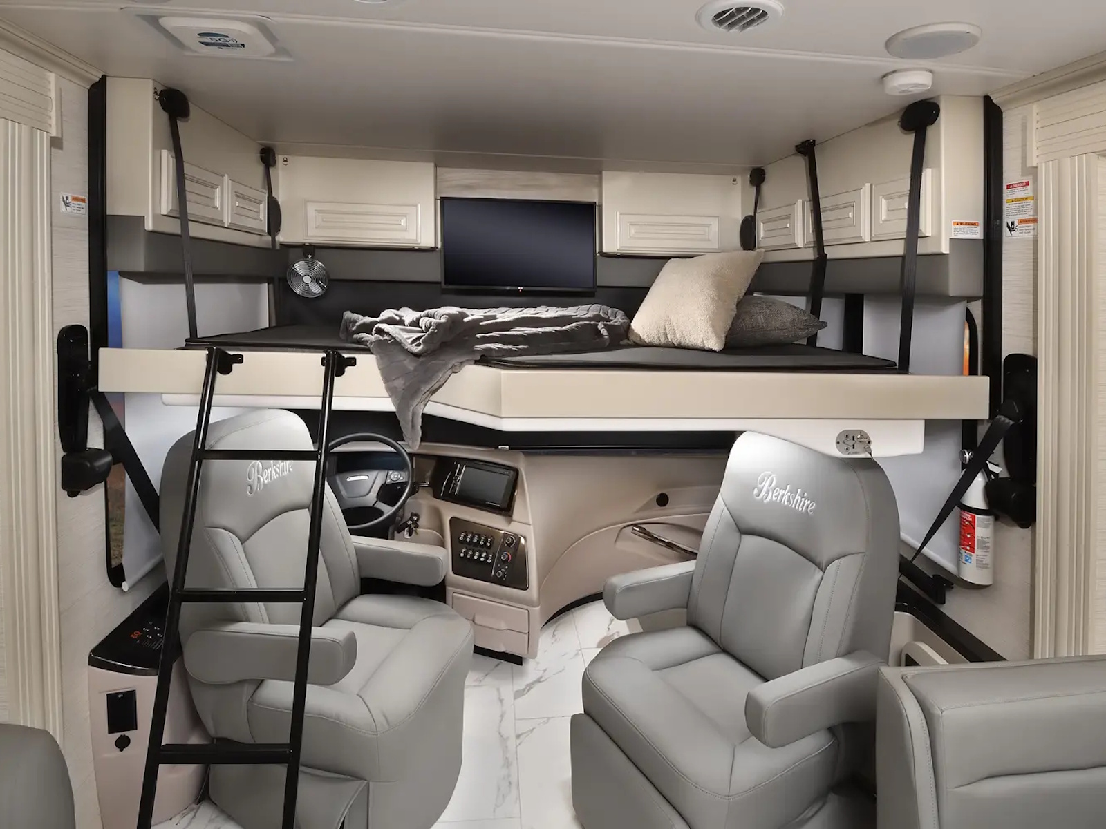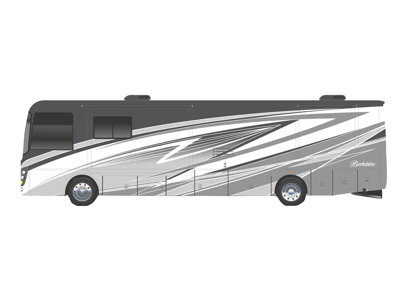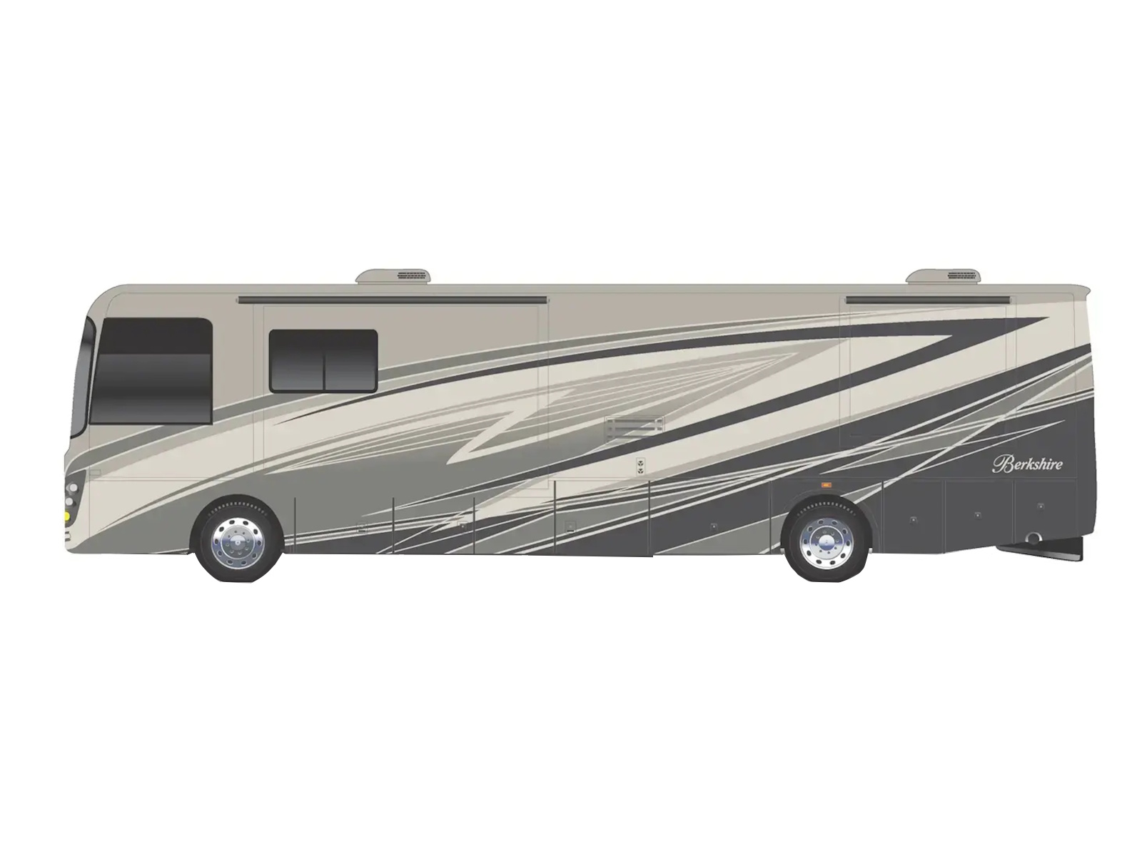 Experience luxury RV travel in a manageable size with the Berkshire 34B by Forest River. This Class A motorhome features three slides for ample space, a king-size Tilt-a-View bed, and a well-equipped kitchen. Perfect for comfortable and stylish road trips.
