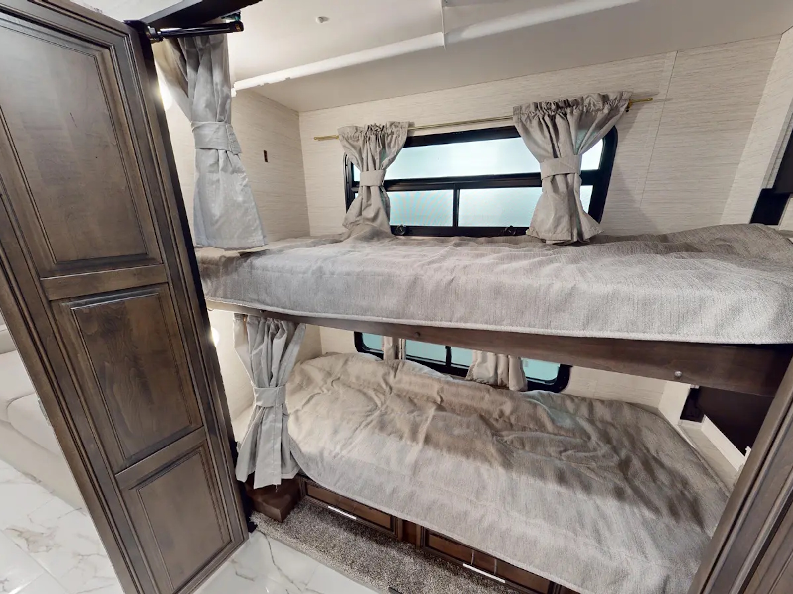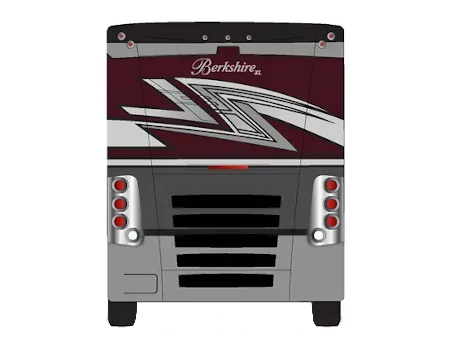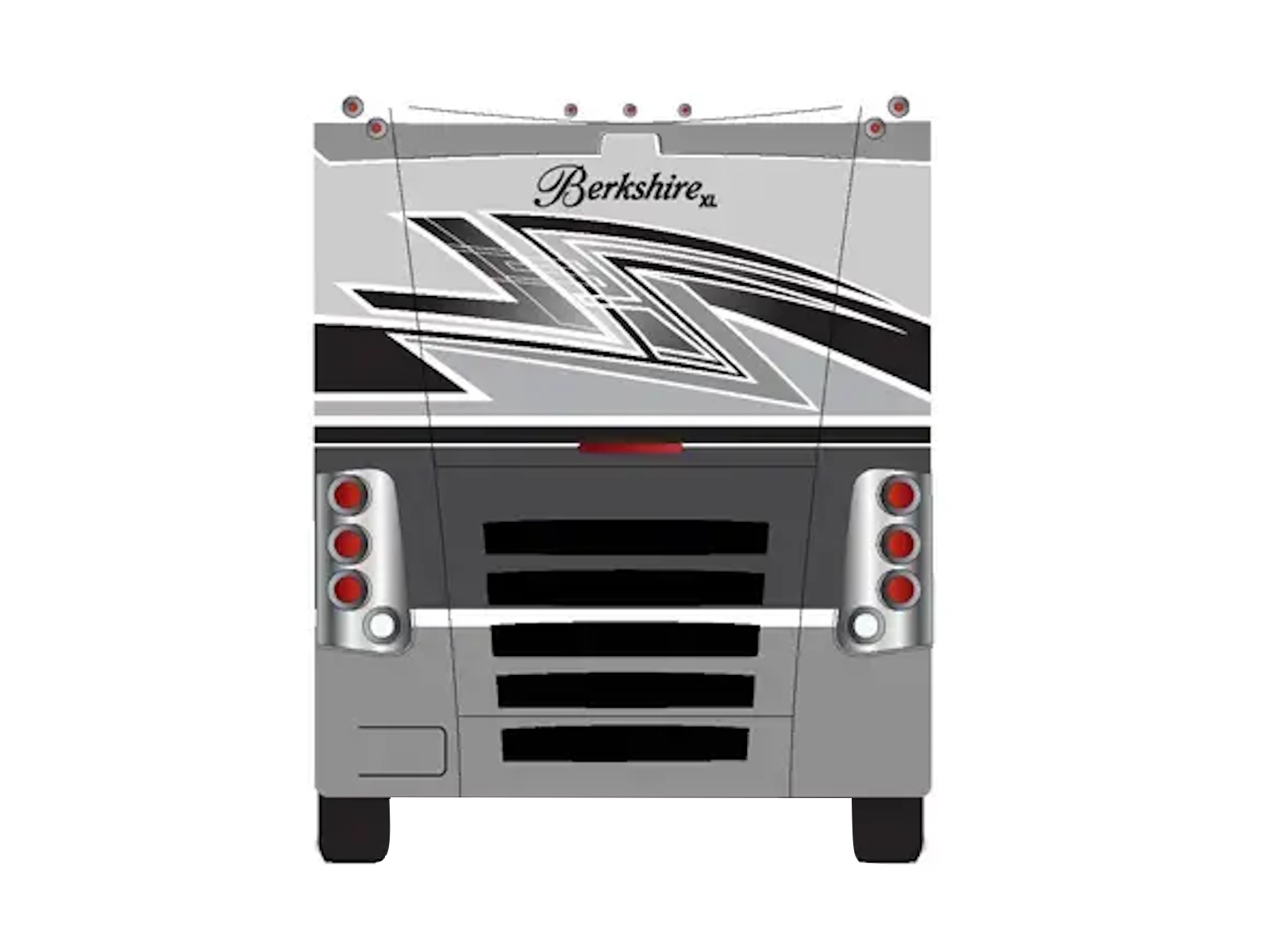 The Berkshire XL 40C is a three slide bunkhouse model with a full and a half bath. The rear full bath includes a shower, vanity sink with medicine cabinet, and stacking washer/dryer. The main bedroom has a slideout, 72" x 80" Tilt-a-View king bed, plus a dresser, wardrobe cabinet, TV, and overhead cupboards. The half bath has a vanity sink, medicine cabinet, and commode. Across from this bathroom is the bunk room/wardrobe combo.