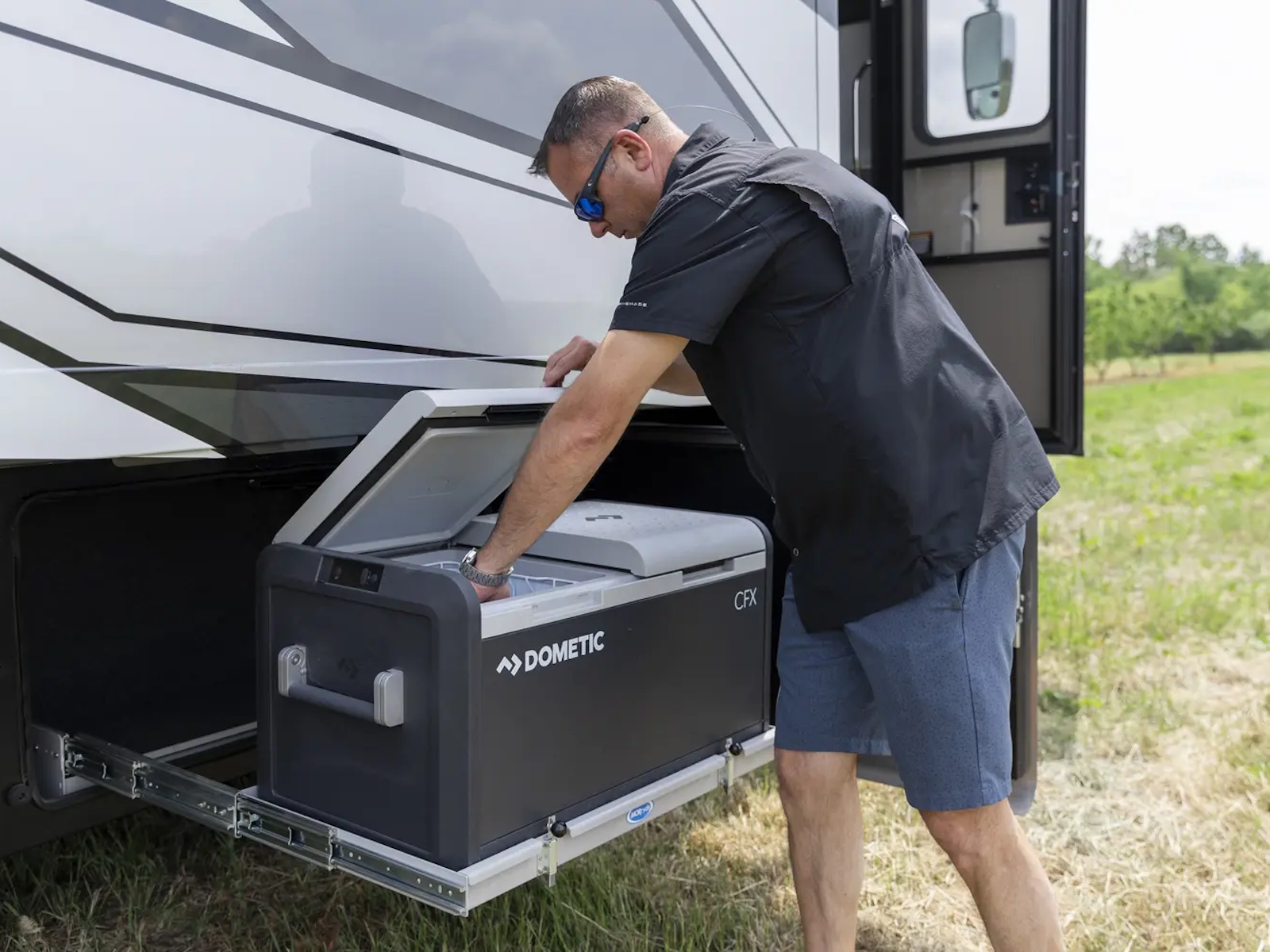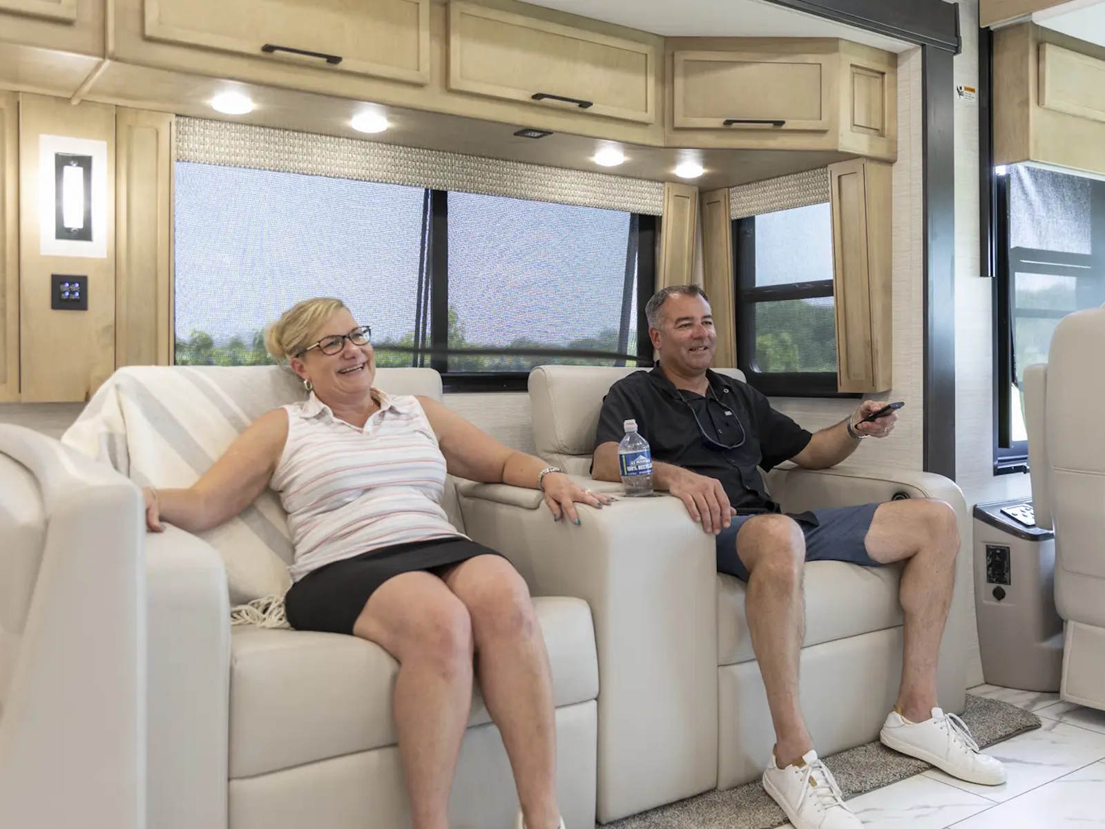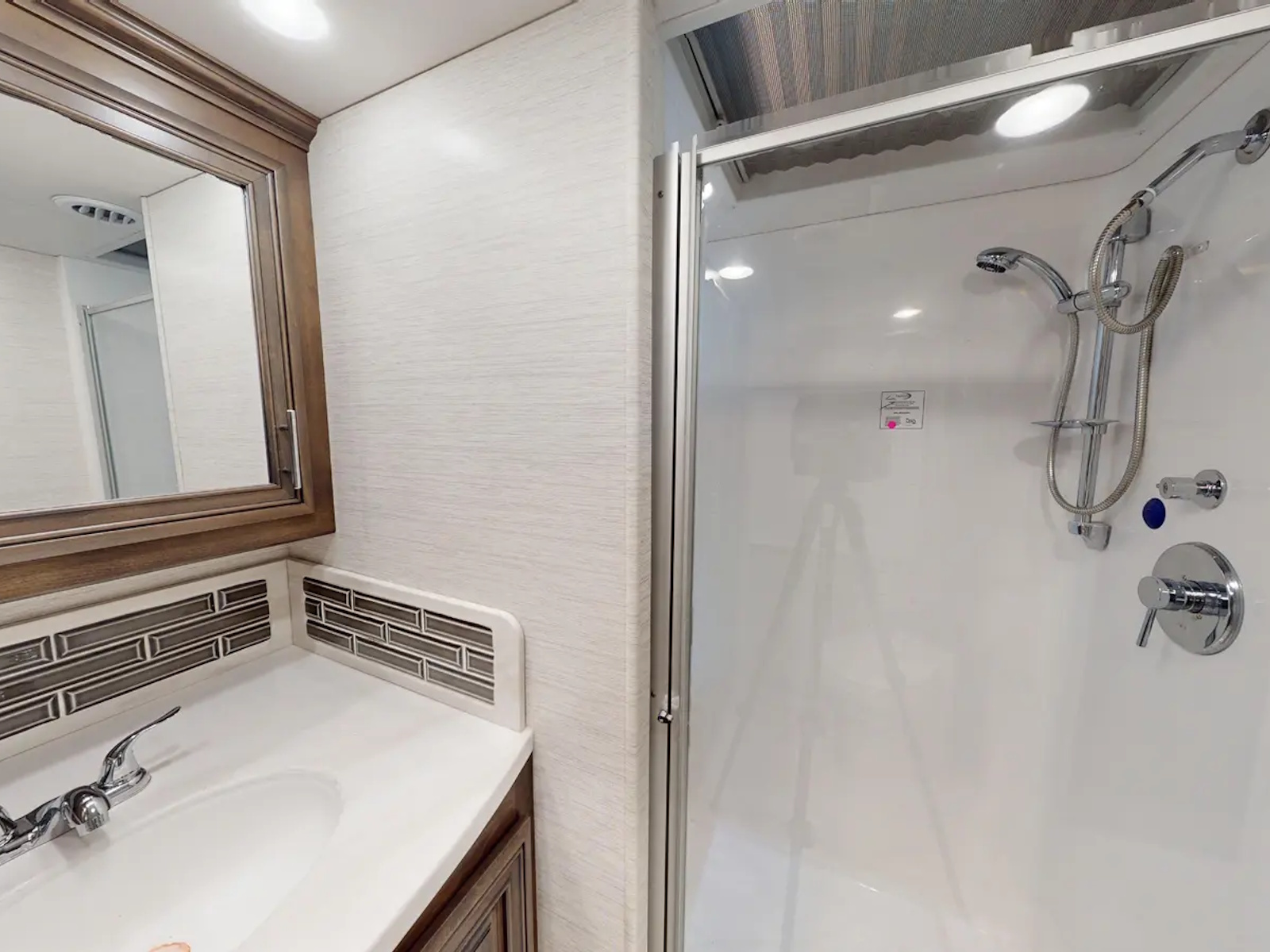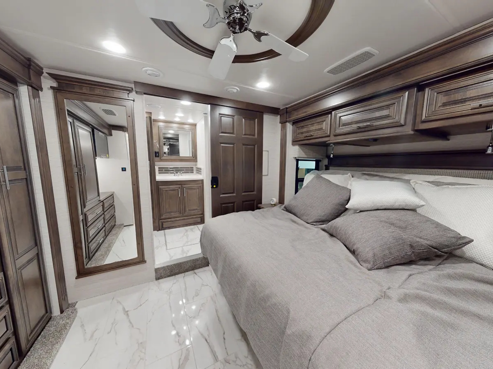 The Berkshire XL 40C is a three slide bunkhouse model with a full and a half bath. The rear full bath includes a shower, vanity sink with medicine cabinet, and stacking washer/dryer. The main bedroom has a slideout, 72" x 80" Tilt-a-View king bed, plus a dresser, wardrobe cabinet, TV, and overhead cupboards. The half bath has a vanity sink, medicine cabinet, and commode. Across from this bathroom is the bunk room/wardrobe combo.