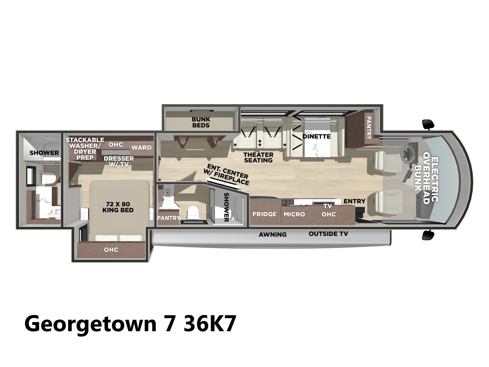 The Georgetown 36K7 by Forest River is designed for family comfort with two full baths and bunks. The kitchen features a farmhouse sink, 3-burner cooktop, microwave, and residential refrigerator. Enjoy entertainment in the theater seats across from a TV. The mid-ship full bath is across from the bunk beds. The bedroom offers a king bed and optional washer/dryer, plus a full master bath. The cab features swivel captain seats, a table, and a power overhead bunk.