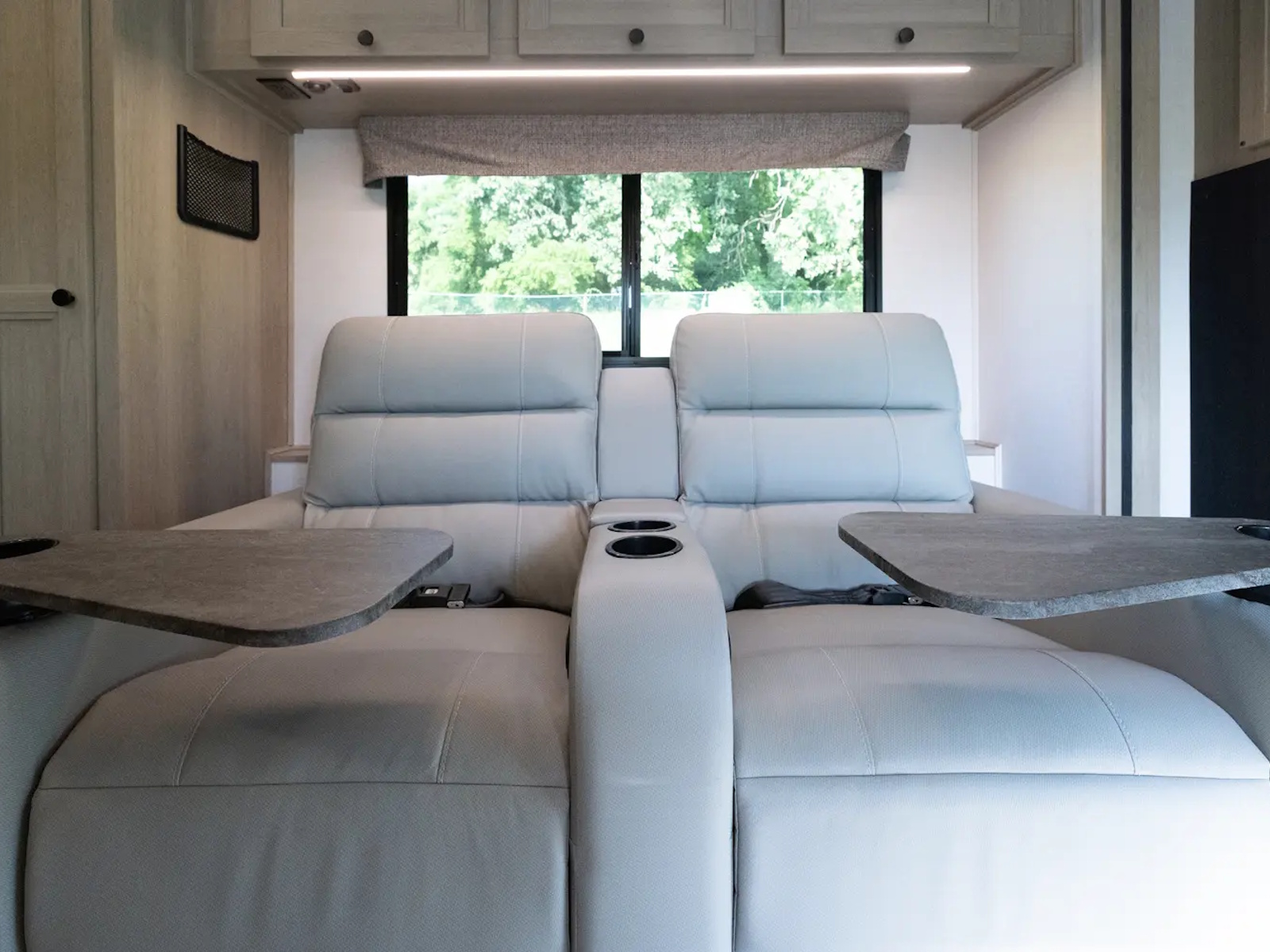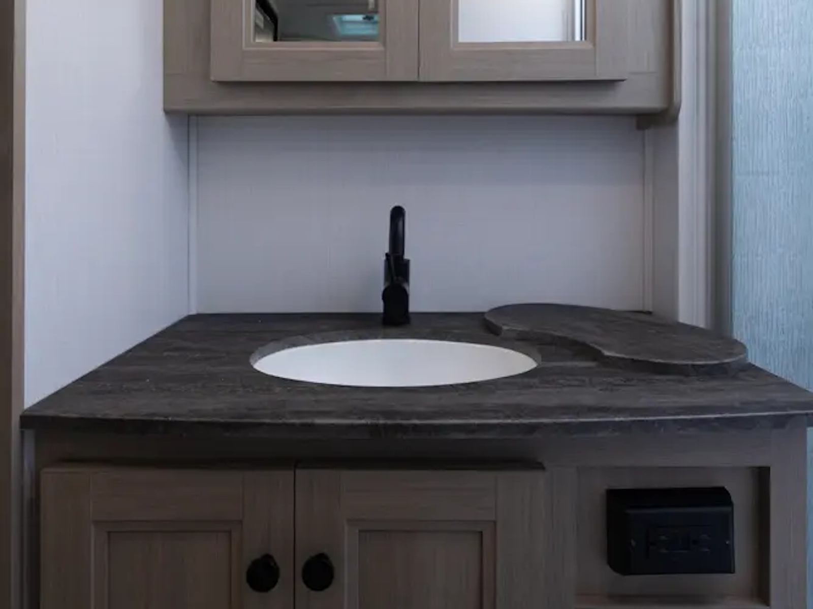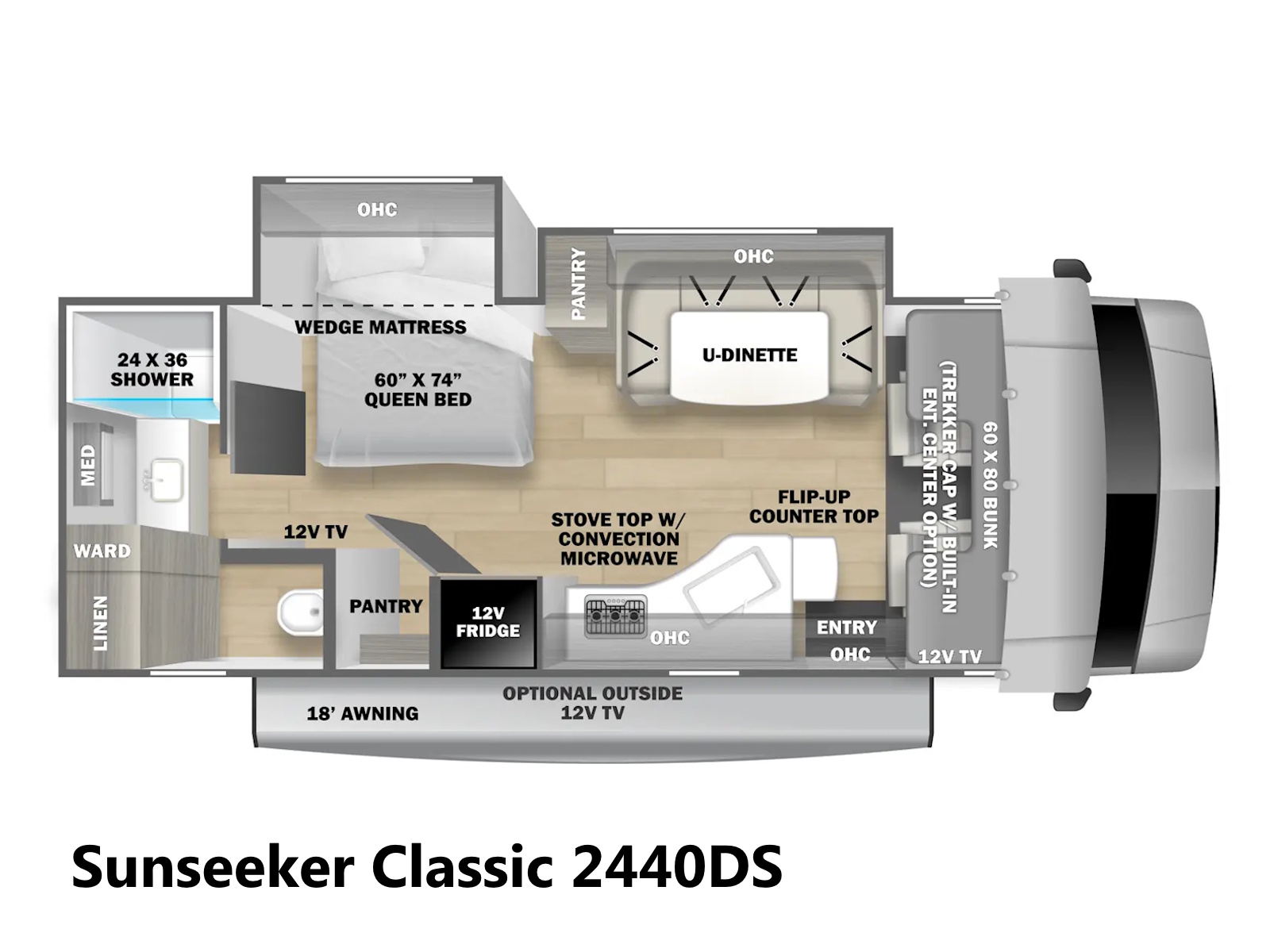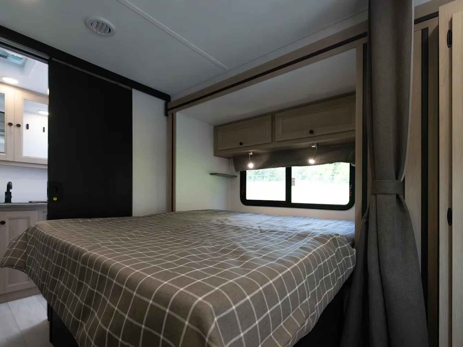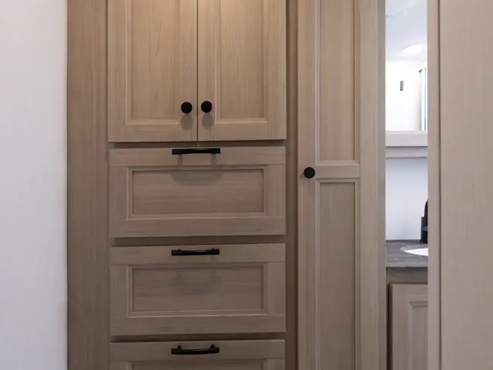 The 2440DS is the perfect couple's rig! There's a queen bed slideout in the rear of the driver's side next to a roomy rear bath with wardrobe and linen closet, plus a residential-style shower surround with built-in molded seat. A second slideout can hold a U-shaped dinette or pair of theater seats, depending on preference. The kitchen is well-appointed with a cooktop, convection microwave, and 12V stainless steel fridge. Two pantry cupboards and overhead cabinets provide additional storage.