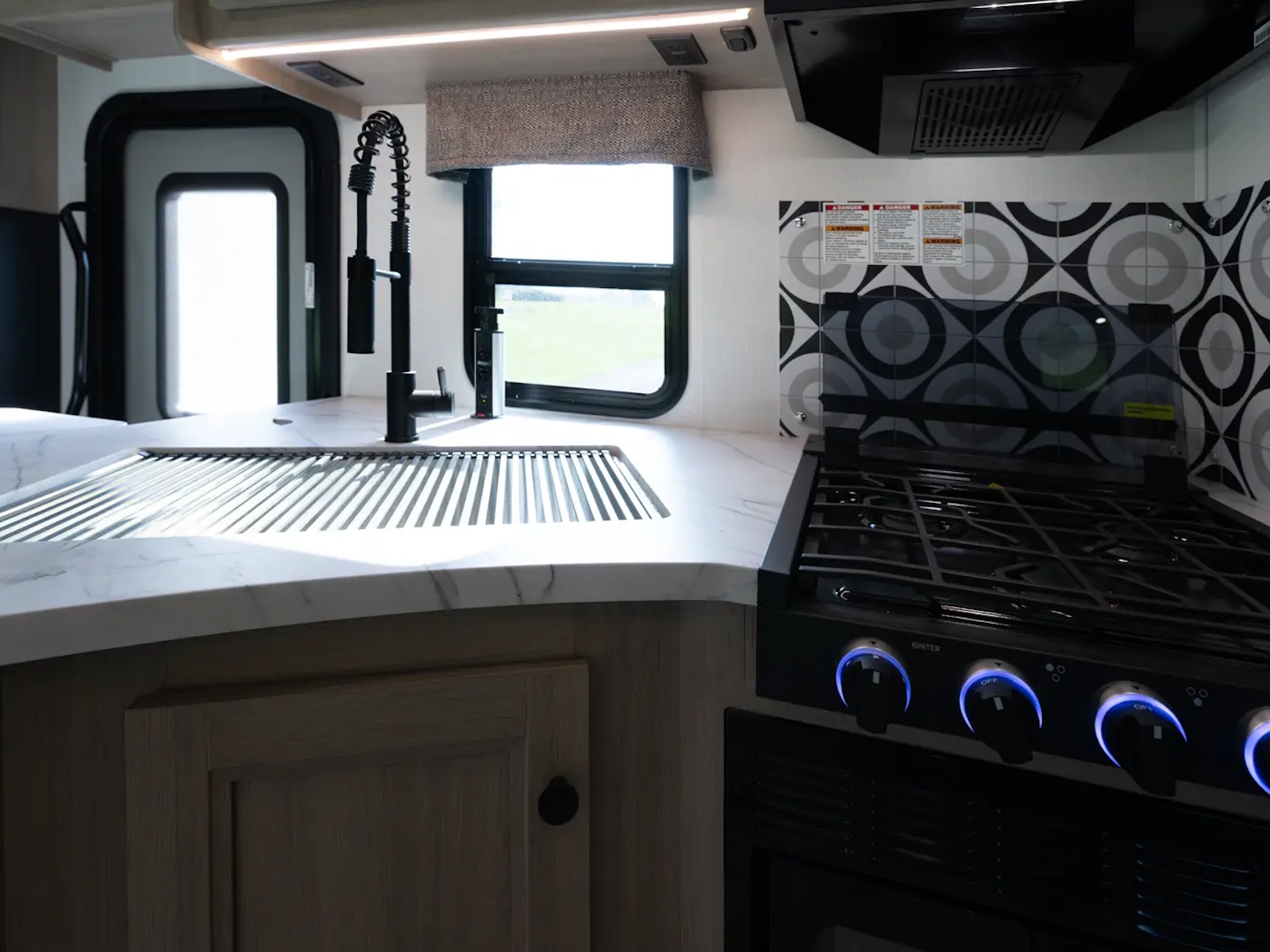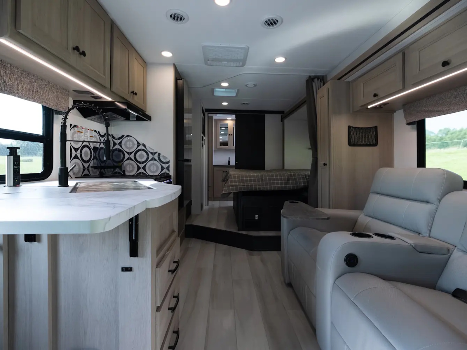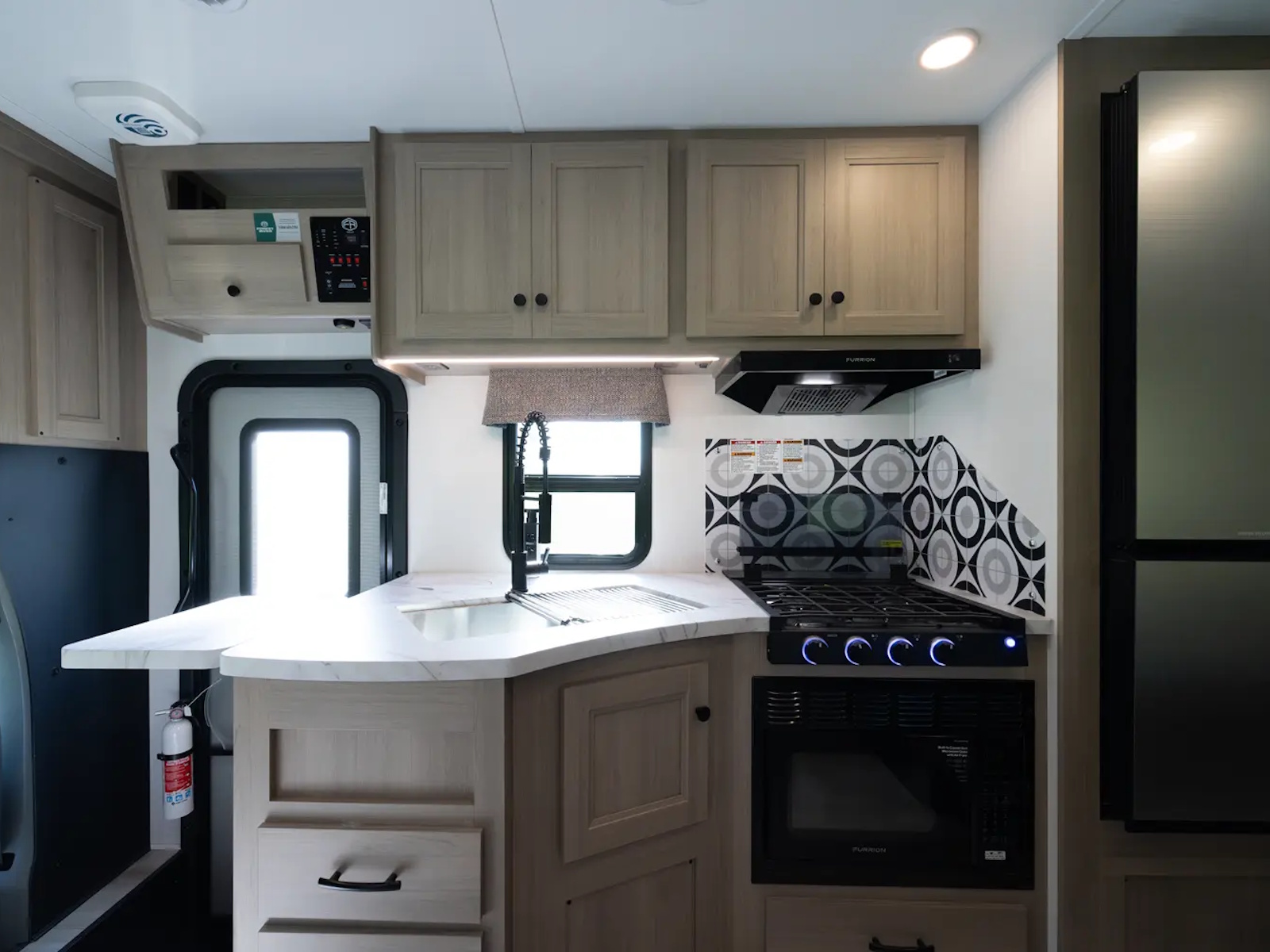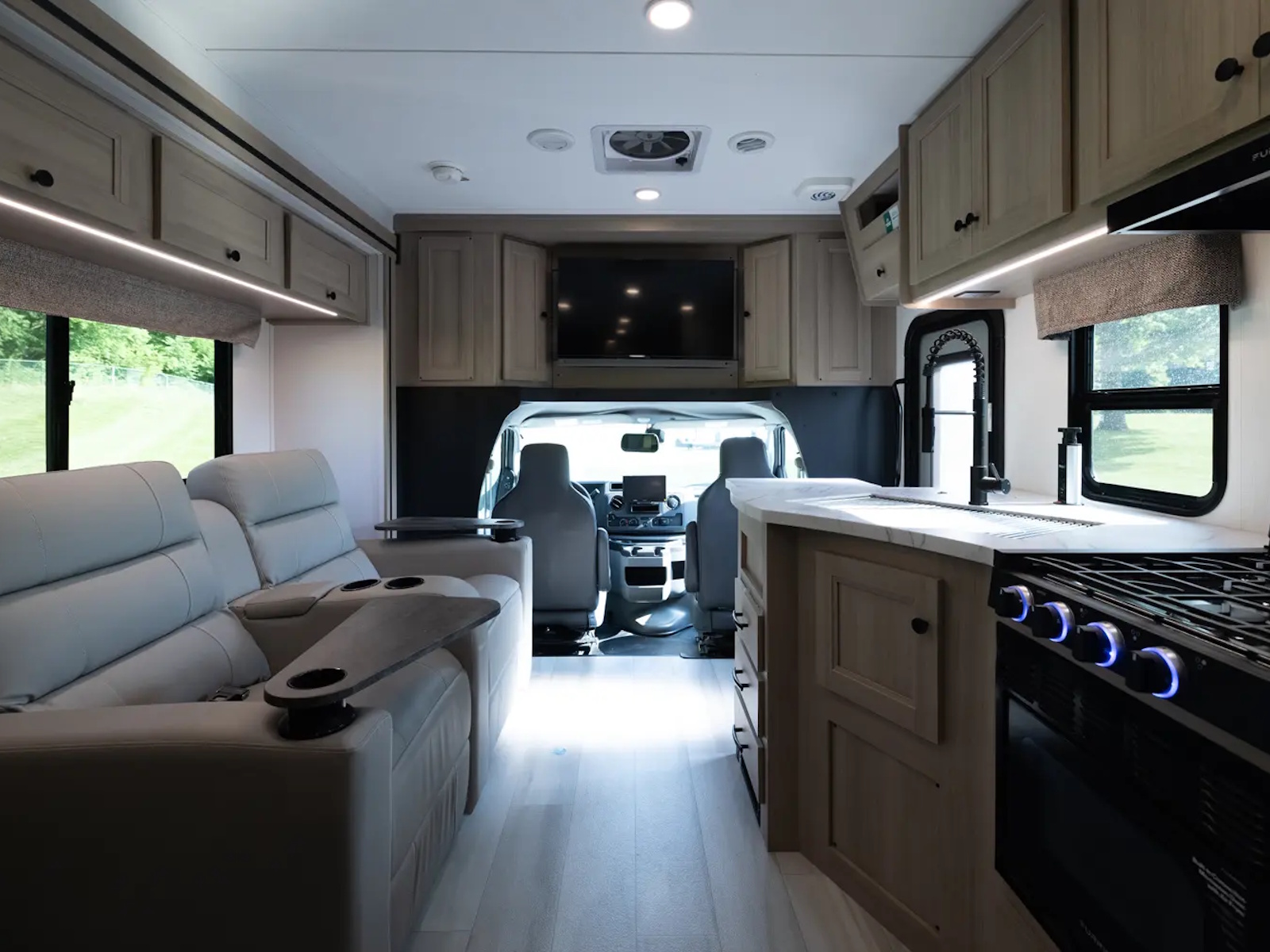The 2440DS is the perfect couple's rig! There's a queen bed slideout in the rear of the driver's side next to a roomy rear bath with wardrobe and linen closet, plus a residential-style shower surround with built-in molded seat. A second slideout can hold a U-shaped dinette or pair of theater seats, depending on preference. The kitchen is well-appointed with a cooktop, convection microwave, and 12V stainless steel fridge. Two pantry cupboards and overhead cabinets provide additional storage.