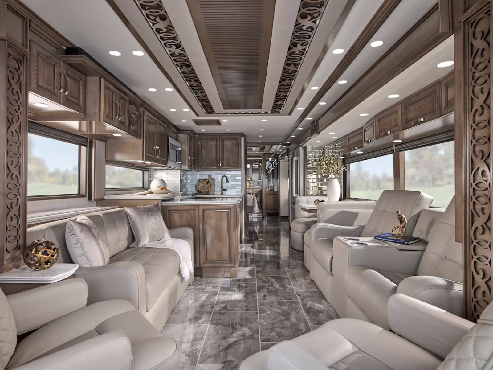 The 2026 Essex offers the perfect balance of elevated comfort and customization options for discerning travelers. Built on your choice of Freightliner® or Spartan® tag axle chassis with a powerful 605 HP engine, the Essex combines responsive handling with consistent power across four meticulously designed 45' floor plans, each maximizing your living space while reflecting your unique travel preferences.