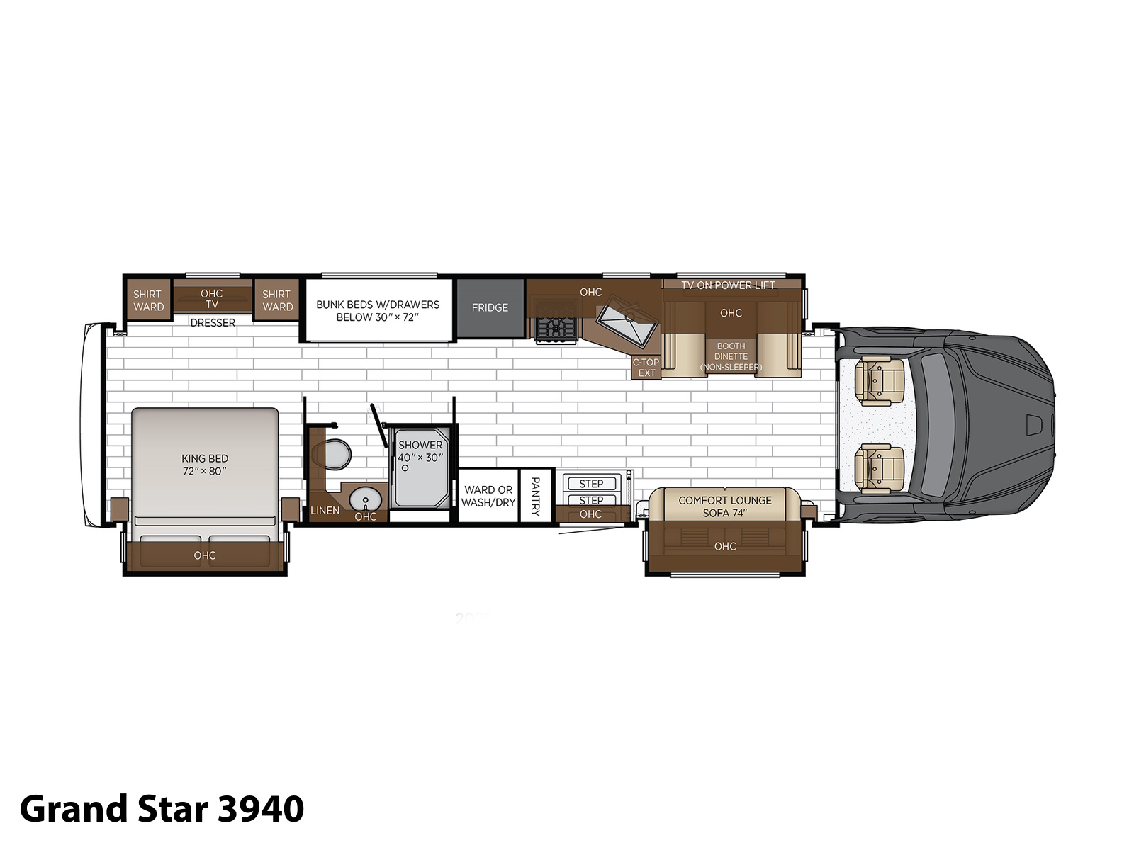 The 2026 Grand Star is a revolutionary and approachable Super C that caters to everyone from first-time RVers to families and empty nesters. Find the floor plan for you below.
